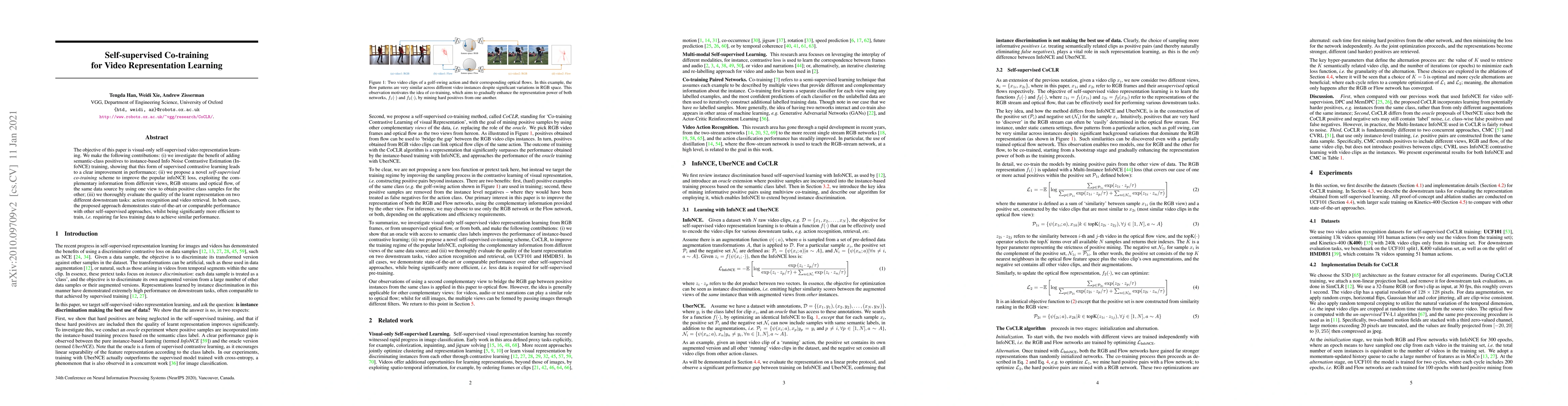 This paper proposes a self-supervised co-training scheme for video representation learning that combines semantic-class positives with instance-based InfoNCE training, achieving improved performance. The method leverages complementary information from RGB streams and optical flow, demonstrating state-of-the-art results in action recognition and video retrieval with higher efficiency.