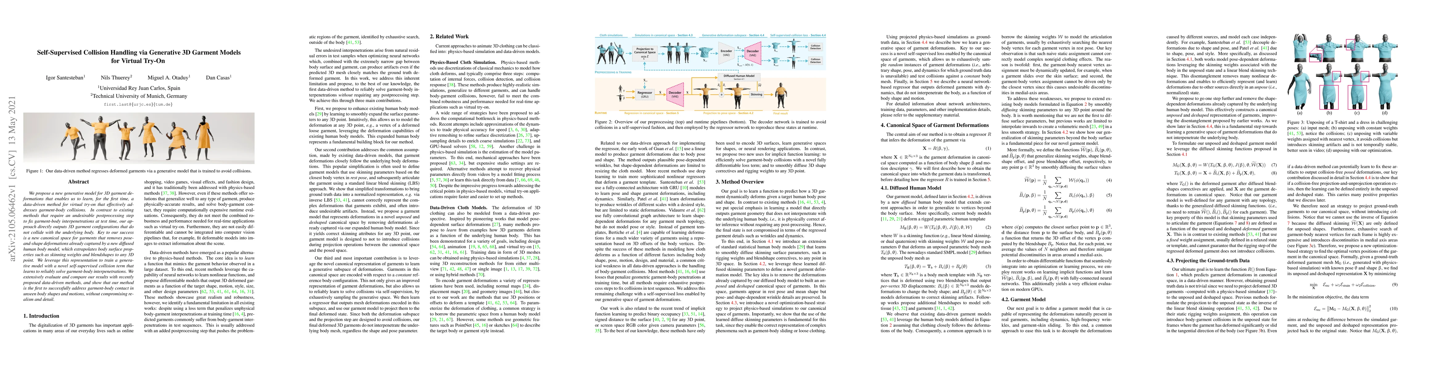This paper proposes a self-supervised generative model for 3D garment deformations that eliminates garment-body collisions during virtual try-on, without the need for postprocessing. The method uses a novel canonical space and a self-supervised collision term to achieve realistic and detailed garment configurations.