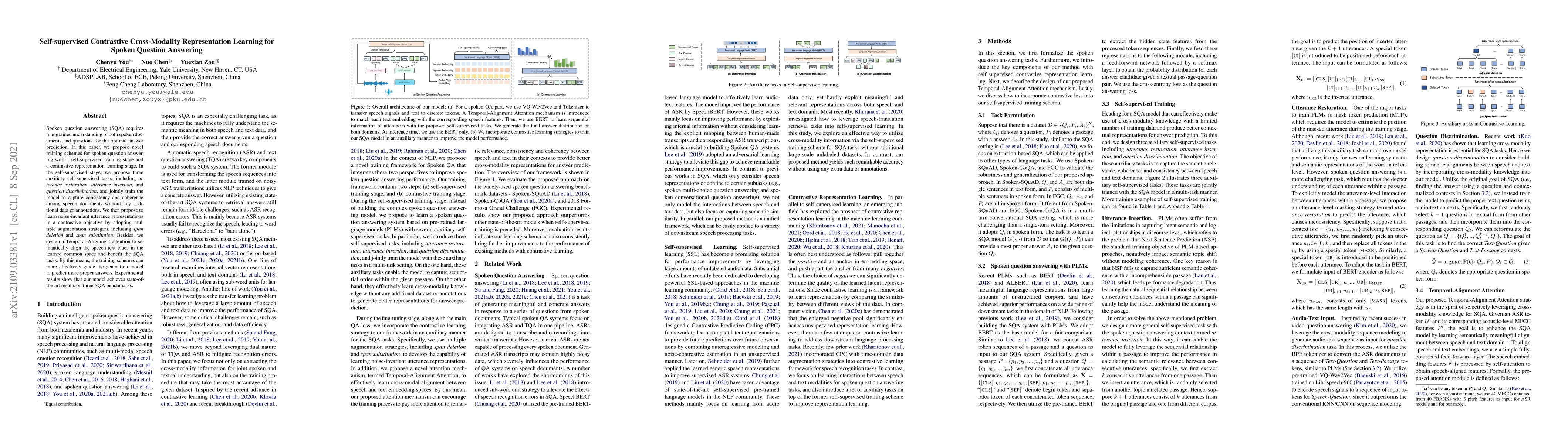 This paper proposes novel training schemes for spoken question answering, utilizing self-supervised learning and contrastive representation learning to enhance model performance. The self-supervised stage includes tasks like utterance restoration and question discrimination, while the contrastive stage uses augmentation strategies to learn robust representations, achieving state-of-the-art results on three benchmarks.