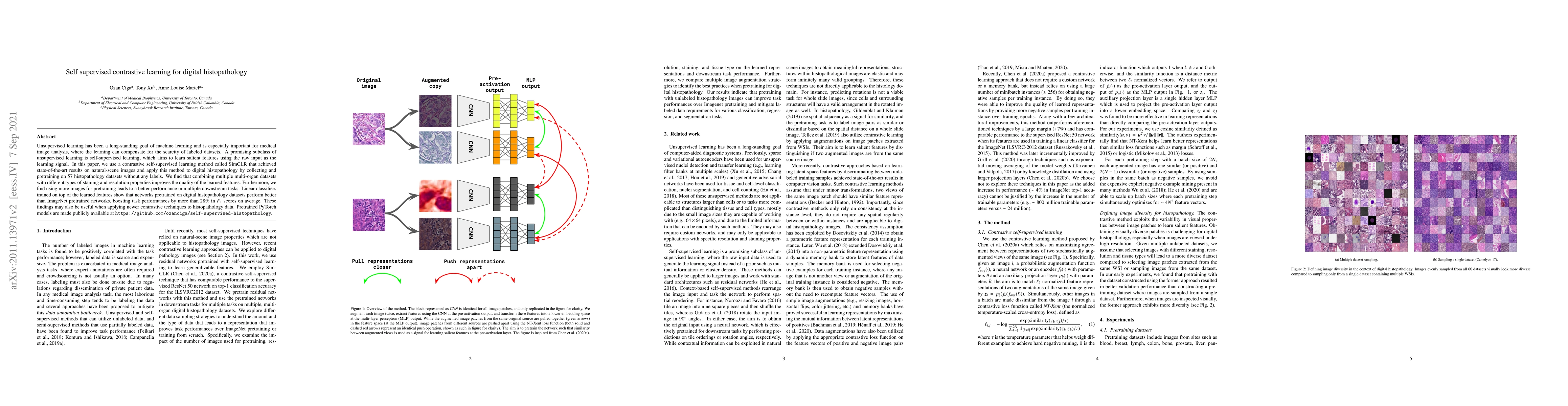 Unsupervised learning has been a long-standing goal of machine learning and is especially important for medical image analysis, where the learning can compensate for the scarcity of labeled datasets. A promising subclass of unsupervised learning is self-supervised learning, which aims to learn salient features using the raw input as the learning signal. In this paper, we use a contrastive self-supervised learning method called SimCLR that achieved state-of-the-art results on natural-scene images and apply this method to digital histopathology by collecting and pretraining on 57 histopathology datasets without any labels. We find that combining multiple multi-organ datasets with different types of staining and resolution properties improves the quality of the learned features. Furthermore, we find using more images for pretraining leads to a better performance in multiple downstream tasks. Linear classifiers trained on top of the learned features show that networks pretrained on digital histopathology datasets perform better than ImageNet pretrained networks, boosting task performances by more than 28% in F1 scores on average. These findings may also be useful when applying newer contrastive techniques to histopathology data. Pretrained PyTorch models are made publicly available at https://github.com/ozanciga/self-supervised-histopathology.