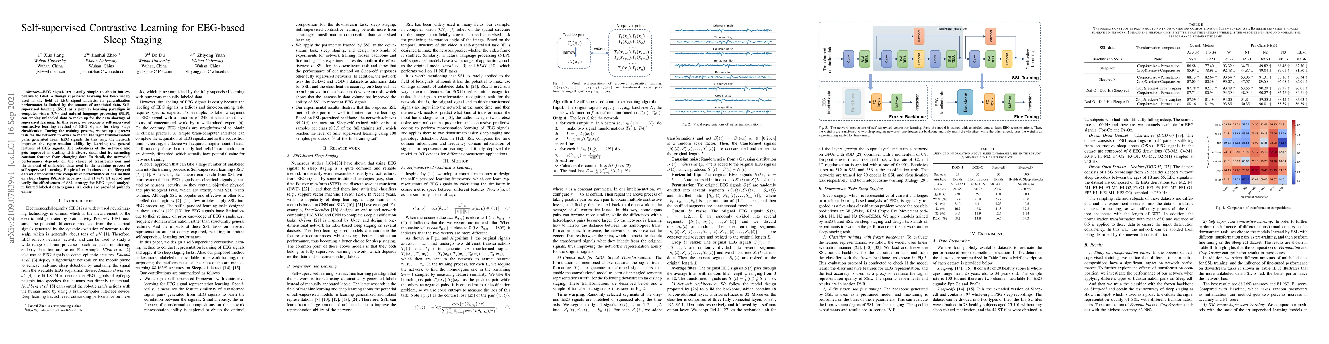 EEG signals are usually simple to obtain but expensive to label. Although supervised learning has been widely used in the field of EEG signal analysis, its generalization performance is limited by the amount of annotated data. Self-supervised learning (SSL), as a popular learning paradigm in computer vision (CV) and natural language processing (NLP), can employ unlabeled data to make up for the data shortage of supervised learning. In this paper, we propose a self-supervised contrastive learning method of EEG signals for sleep stage classification. During the training process, we set up a pretext task for the network in order to match the right transformation pairs generated from EEG signals. In this way, the network improves the representation ability by learning the general features of EEG signals. The robustness of the network also gets improved in dealing with diverse data, that is, extracting constant features from changing data. In detail, the network's performance depends on the choice of transformations and the amount of unlabeled data used in the training process of self-supervised learning. Empirical evaluations on the Sleep-edf dataset demonstrate the competitive performance of our method on sleep staging (88.16% accuracy and 81.96% F1 score) and verify the effectiveness of SSL strategy for EEG signal analysis in limited labeled data regimes. All codes are provided publicly online.