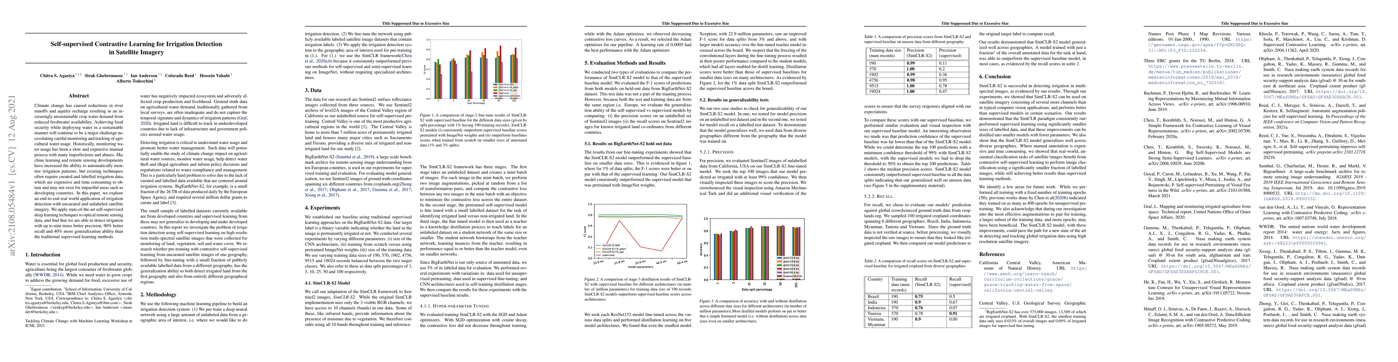 This paper proposes a self-supervised contrastive learning approach for detecting irrigation in satellite imagery, aiming to overcome the limitations of traditional supervised methods that require expensive labeled data. The method achieves significantly higher precision, recall, and generalization using uncurated and unlabeled satellite imagery.