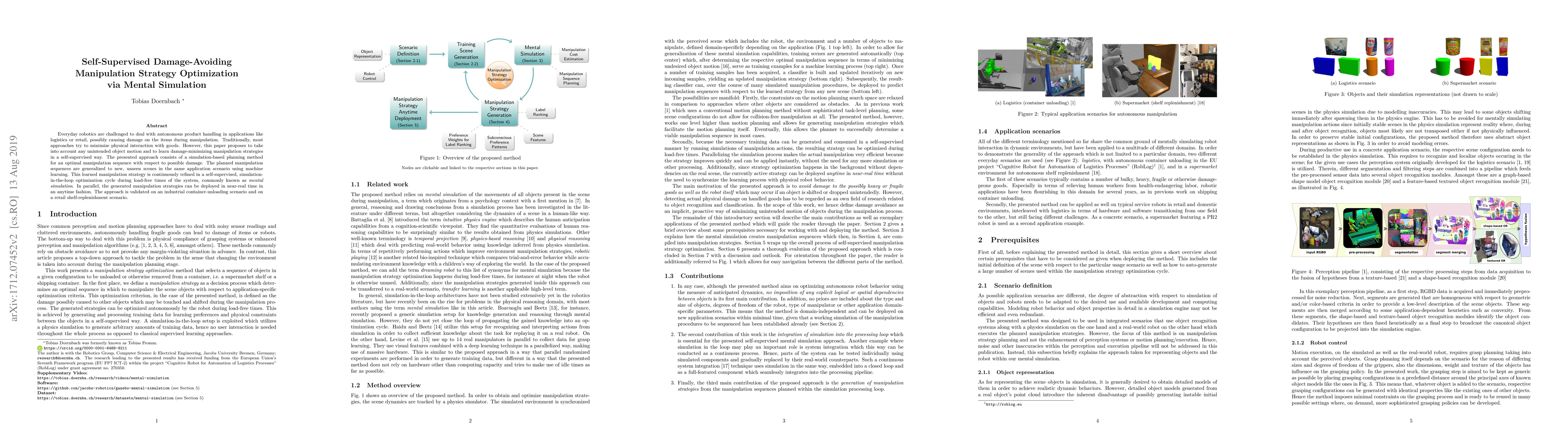 This paper proposes a self-supervised strategy for optimizing damage-avoiding manipulation in robotics through mental simulation, using simulation-based planning to learn optimal manipulation sequences that minimize unintended object motion and damage. The approach is validated in industrial and retail scenarios.