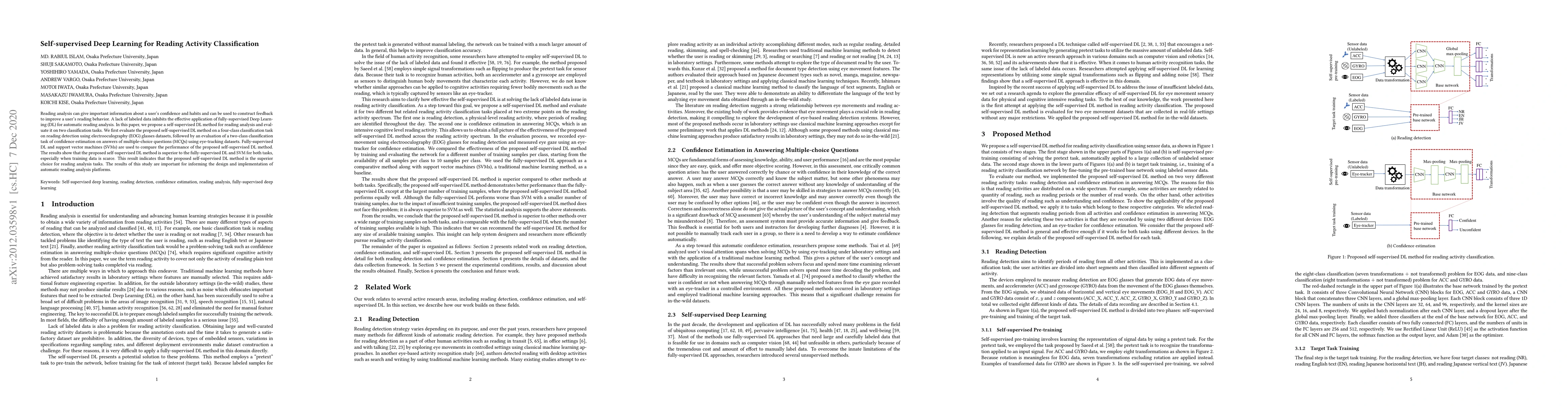 This paper proposes a self-supervised deep learning method for reading activity classification, demonstrating its effectiveness over fully-supervised deep learning and SVMs, especially with limited labeled data. The method is evaluated on reading detection and confidence estimation tasks, showing superior performance.