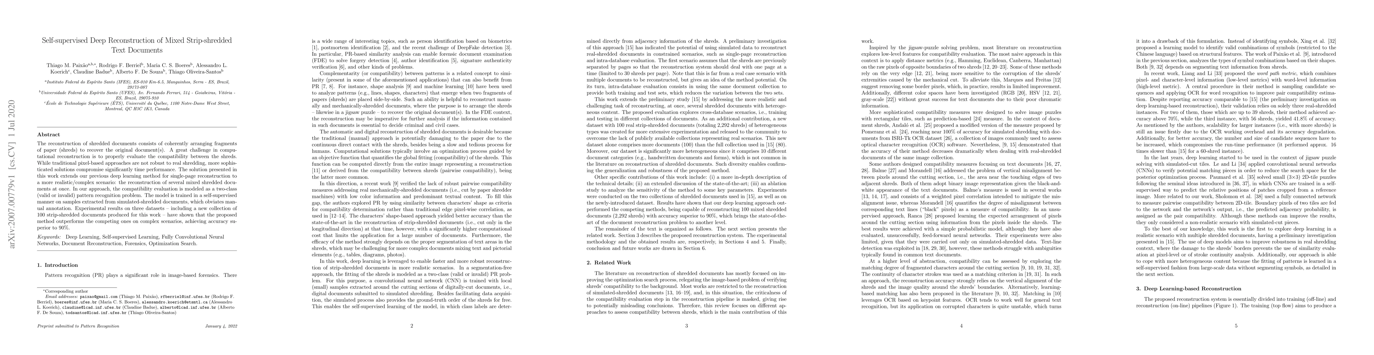 This paper proposes a self-supervised deep learning method for reconstructing mixed strip-shredded documents by modeling compatibility evaluation as a two-class pattern recognition problem. The method outperforms traditional and other advanced techniques, achieving over 90% accuracy on multiple datasets.