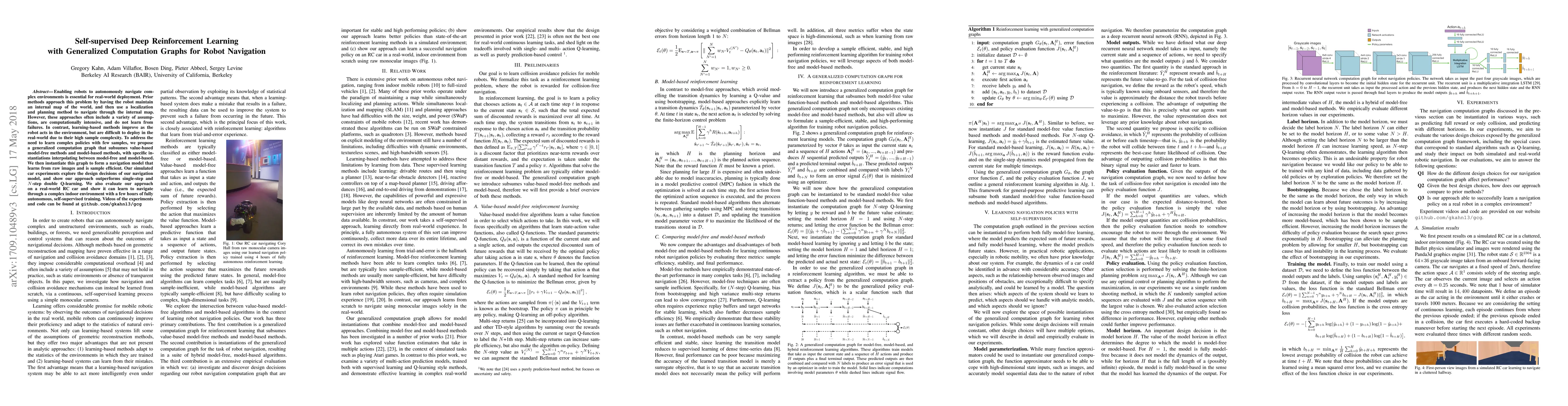 This paper proposes a self-supervised deep reinforcement learning method using generalized computation graphs for robot navigation, achieving sample efficiency and performance improvements over traditional Q-learning methods. The approach is validated through simulations and real-world experiments with an RC car.