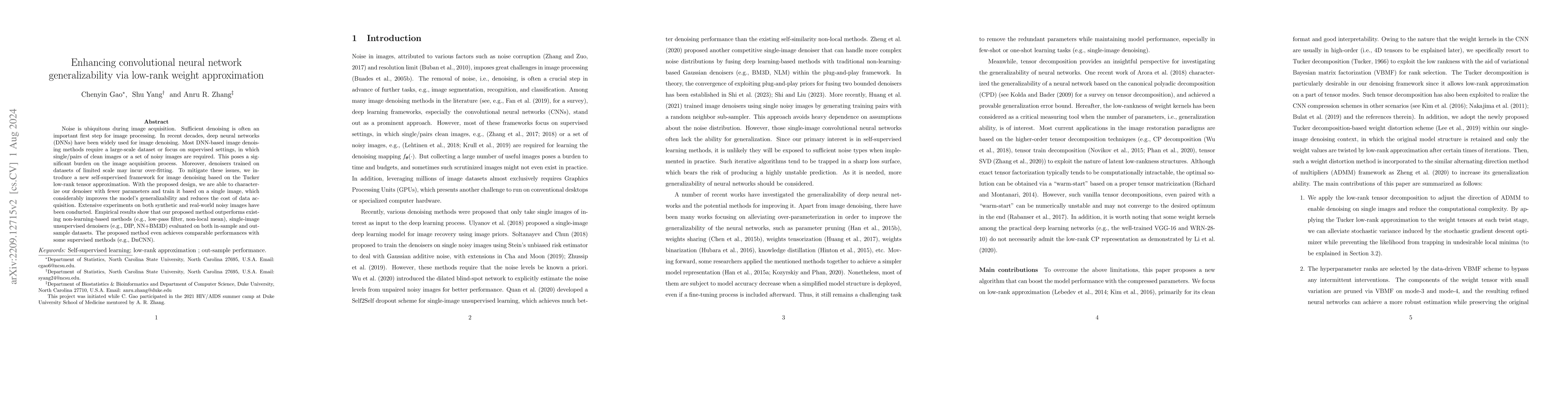 This paper presents a self-supervised denoising framework using a low-rank tensor-approximated convolutional neural network (CNN) that requires only a single image for training, significantly reducing data acquisition costs and improving model generalizability. Experimental results show superior performance compared to non-learning and unsupervised methods, and competitive results against some supervised methods.