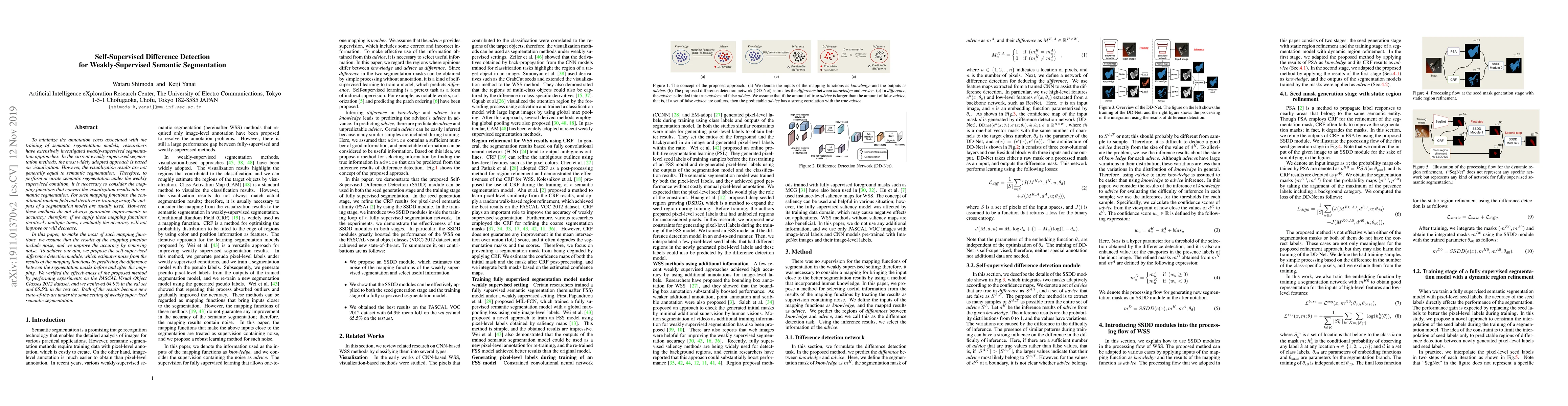 This paper proposes a self-supervised difference detection module to improve weakly-supervised semantic segmentation by removing noise from mapping functions that convert visualization results into segmentation maps. Experiments on the PASCAL VOC 2012 dataset achieved new state-of-the-art results, with 64.9% on the validation set and 65.5% on the test set.