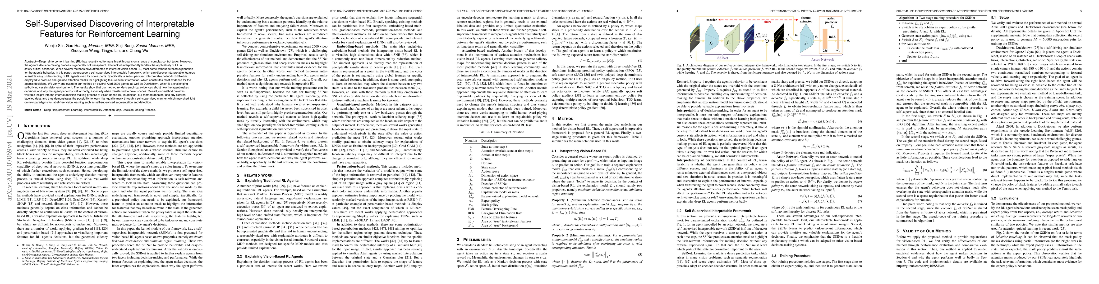 This paper proposes a self-supervised framework to discover interpretable features for reinforcement learning (RL) agents, using a self-supervised interpretable network (SSINet) to generate attention masks. The method provides insights into the decision-making process of vision-based RL agents without requiring external labeled data, demonstrated through Atari games and Duckietown simulations.