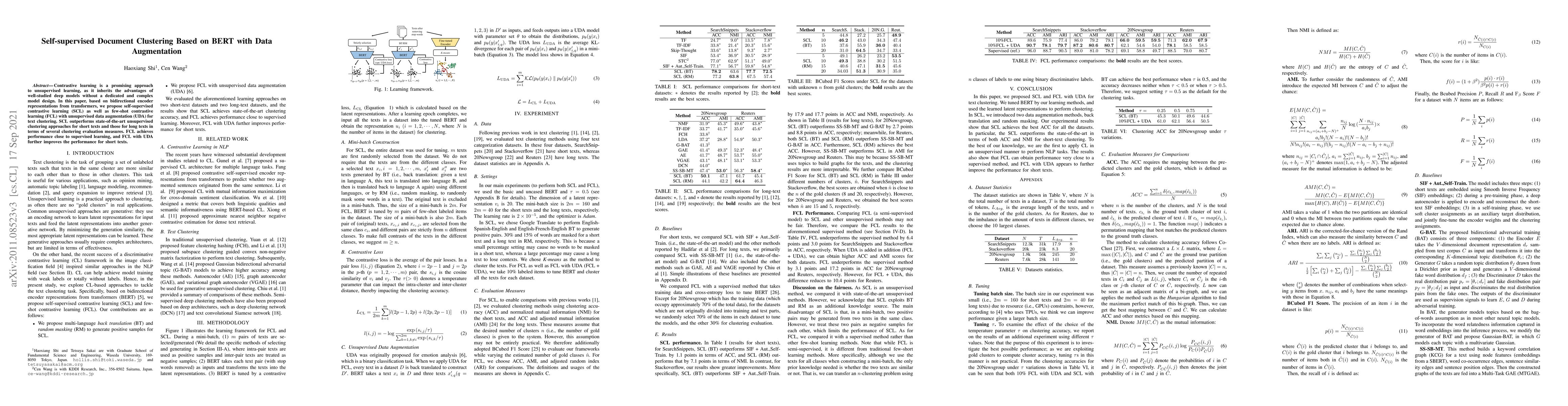 This paper proposes self-supervised contrastive learning (SCL) and few-shot contrastive learning (FCL) with unsupervised data augmentation for document clustering. SCL outperforms existing methods for both short and long texts, while FCL with UDA further enhances performance for short texts.