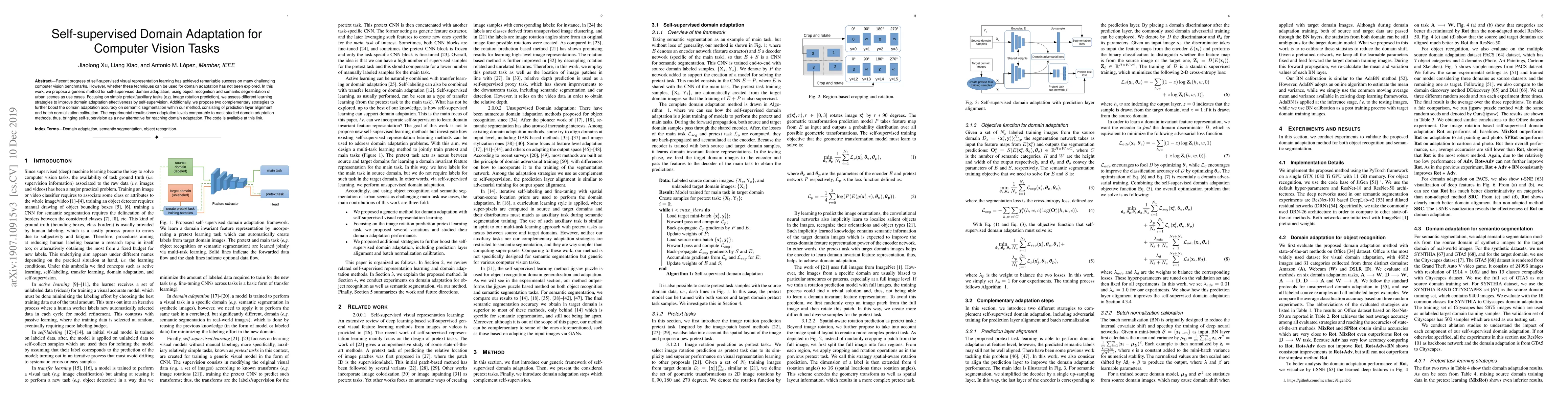 This paper proposes a self-supervised domain adaptation method for computer vision tasks, using object recognition and urban scene semantic segmentation as test cases. The method employs simple pretext tasks like image rotation prediction to enhance adaptation effectiveness and introduces strategies like prediction layer alignment and batch normalization calibration to boost accuracy, achieving competitive results.