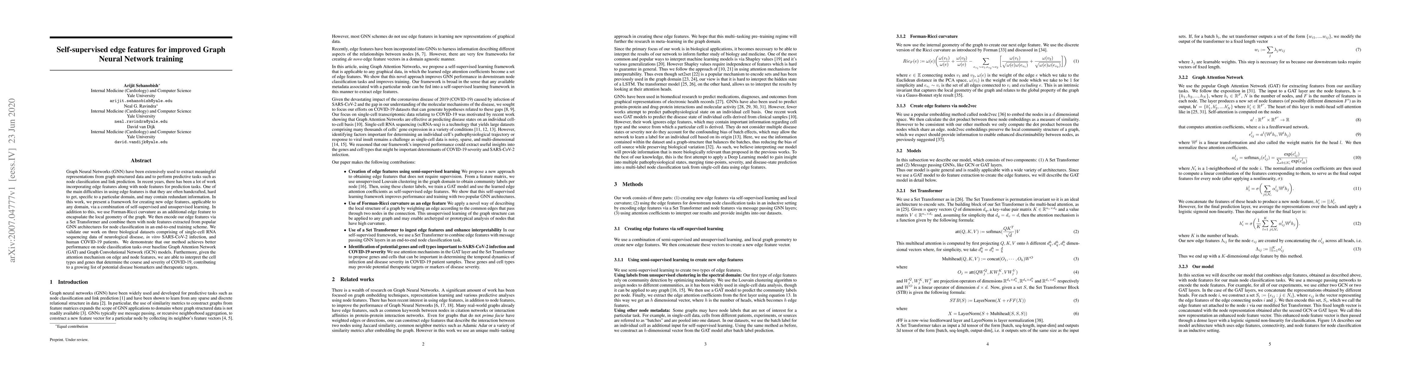 Graph Neural Networks (GNN) have been extensively used to extract meaningful representations from graph structured data and to perform predictive tasks such as node classification and link prediction. In recent years, there has been a lot of work incorporating edge features along with node features for prediction tasks. One of the main difficulties in using edge features is that they are often handcrafted, hard to get, specific to a particular domain, and may contain redundant information. In this work, we present a framework for creating new edge features, applicable to any domain, via a combination of self-supervised and unsupervised learning. In addition to this, we use Forman-Ricci curvature as an additional edge feature to encapsulate the local geometry of the graph. We then encode our edge features via a Set Transformer and combine them with node features extracted from popular GNN architectures for node classification in an end-to-end training scheme. We validate our work on three biological datasets comprising of single-cell RNA sequencing data of neurological disease, \textit{in vitro} SARS-CoV-2 infection, and human COVID-19 patients. We demonstrate that our method achieves better performance on node classification tasks over baseline Graph Attention Network (GAT) and Graph Convolutional Network (GCN) models. Furthermore, given the attention mechanism on edge and node features, we are able to interpret the cell types and genes that determine the course and severity of COVID-19, contributing to a growing list of potential disease biomarkers and therapeutic targets.