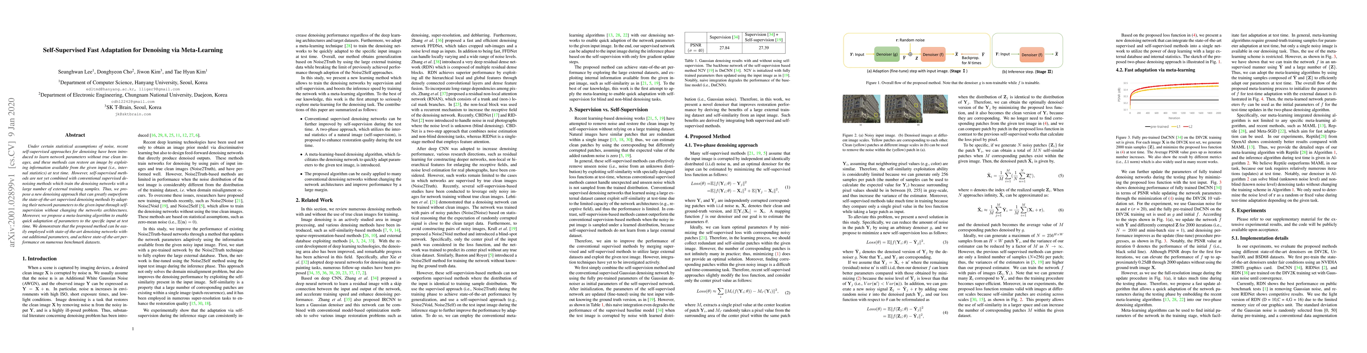 Under certain statistical assumptions of noise, recent self-supervised approaches for denoising have been introduced to learn network parameters without true clean images, and these methods can restore an image by exploiting information available from the given input (i.e., internal statistics) at test time. However, self-supervised methods are not yet combined with conventional supervised denoising methods which train the denoising networks with a large number of external training samples. Thus, we propose a new denoising approach that can greatly outperform the state-of-the-art supervised denoising methods by adapting their network parameters to the given input through selfsupervision without changing the networks architectures. Moreover, we propose a meta-learning algorithm to enable quick adaptation of parameters to the specific input at test time. We demonstrate that the proposed method can be easily employed with state-of-the-art denoising networks without additional parameters, and achieve state-of-the-art performance on numerous benchmark datasets.