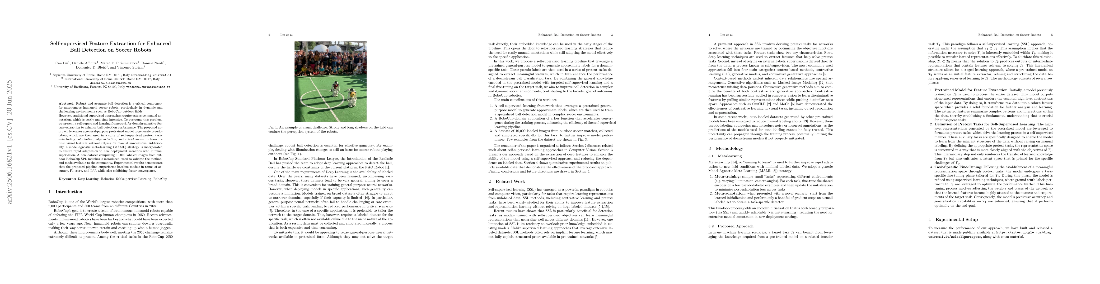 Robust and accurate ball detection is a critical component for autonomous humanoid soccer robots, particularly in dynamic and challenging environments such as RoboCup outdoor fields. However, traditional supervised approaches require extensive manual annotation, which is costly and time-intensive. To overcome this problem, we present a self-supervised learning framework for domain-adaptive feature extraction to enhance ball detection performance. The proposed approach leverages a general-purpose pretrained model to generate pseudo-labels, which are then used in a suite of self-supervised pretext tasks -- including colorization, edge detection, and triplet loss -- to learn robust visual features without relying on manual annotations. Additionally, a model-agnostic meta-learning (MAML) strategy is incorporated to ensure rapid adaptation to new deployment scenarios with minimal supervision. A new dataset comprising 10,000 labeled images from outdoor RoboCup SPL matches is introduced, used to validate the method, and made available to the community. Experimental results demonstrate that the proposed pipeline outperforms baseline models in terms of accuracy, F1 score, and IoU, while also exhibiting faster convergence.