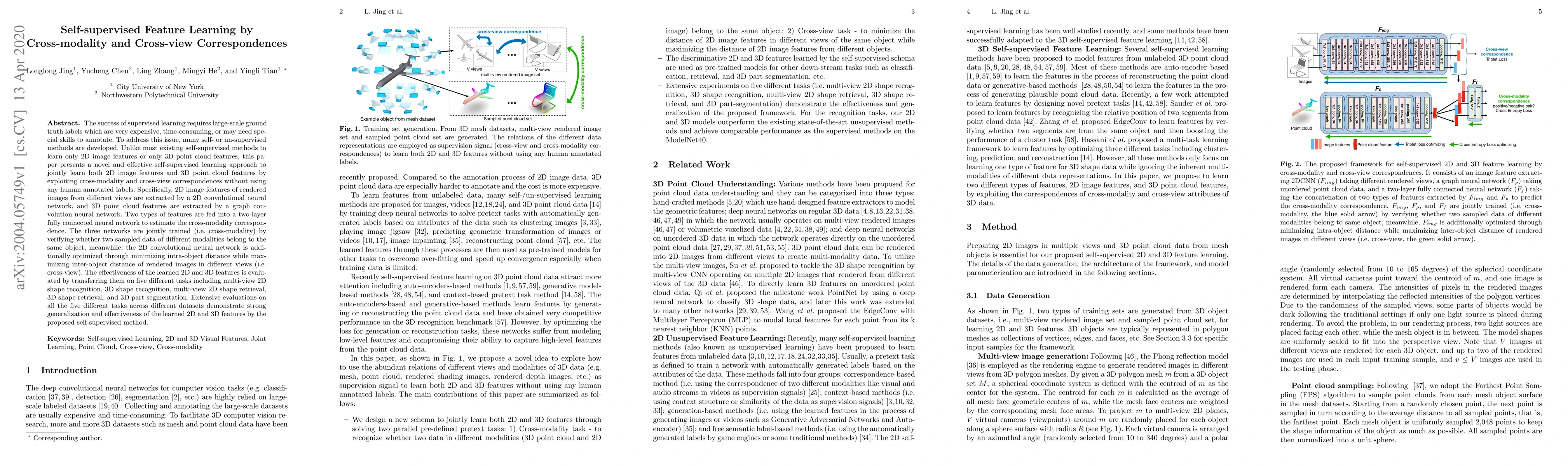 This paper proposes a self-supervised learning method to jointly learn 2D image and 3D point cloud features using cross-modality and cross-view correspondences without human annotations. The method trains networks to extract features from rendered images and point clouds, then estimates correspondences to optimize feature learning, demonstrating strong generalization across multiple tasks.