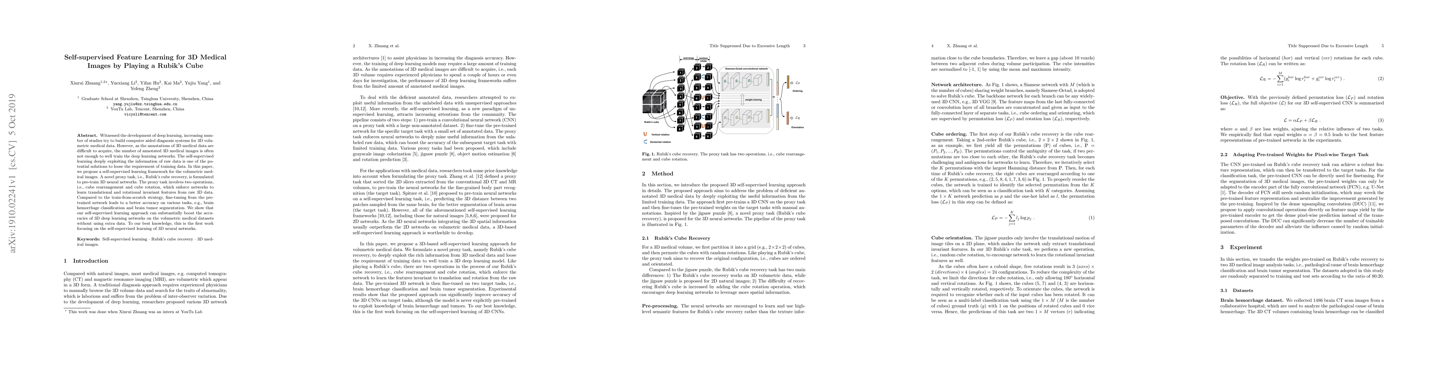 This paper proposes a self-supervised learning framework for 3D medical images using a Rubik's cube recovery task to pre-train neural networks, enabling them to learn translational and rotational invariant features. The approach significantly improves the accuracy of deep learning models for tasks like brain hemorrhage classification and tumor segmentation without requiring additional annotated data.