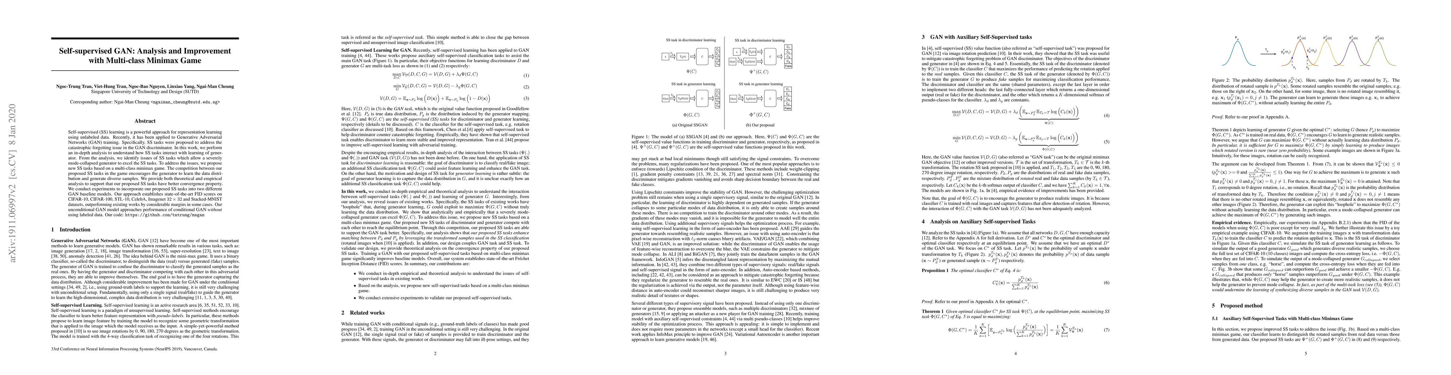 Self-supervised (SS) learning is a powerful approach for representation learning using unlabeled data. Recently, it has been applied to Generative Adversarial Networks (GAN) training. Specifically, SS tasks were proposed to address the catastrophic forgetting issue in the GAN discriminator. In this work, we perform an in-depth analysis to understand how SS tasks interact with learning of generator. From the analysis, we identify issues of SS tasks which allow a severely mode-collapsed generator to excel the SS tasks. To address the issues, we propose new SS tasks based on a multi-class minimax game. The competition between our proposed SS tasks in the game encourages the generator to learn the data distribution and generate diverse samples. We provide both theoretical and empirical analysis to support that our proposed SS tasks have better convergence property. We conduct experiments to incorporate our proposed SS tasks into two different GAN baseline models. Our approach establishes state-of-the-art FID scores on CIFAR-10, CIFAR-100, STL-10, CelebA, Imagenet $32\times32$ and Stacked-MNIST datasets, outperforming existing works by considerable margins in some cases. Our unconditional GAN model approaches performance of conditional GAN without using labeled data. Our code: https://github.com/tntrung/msgan