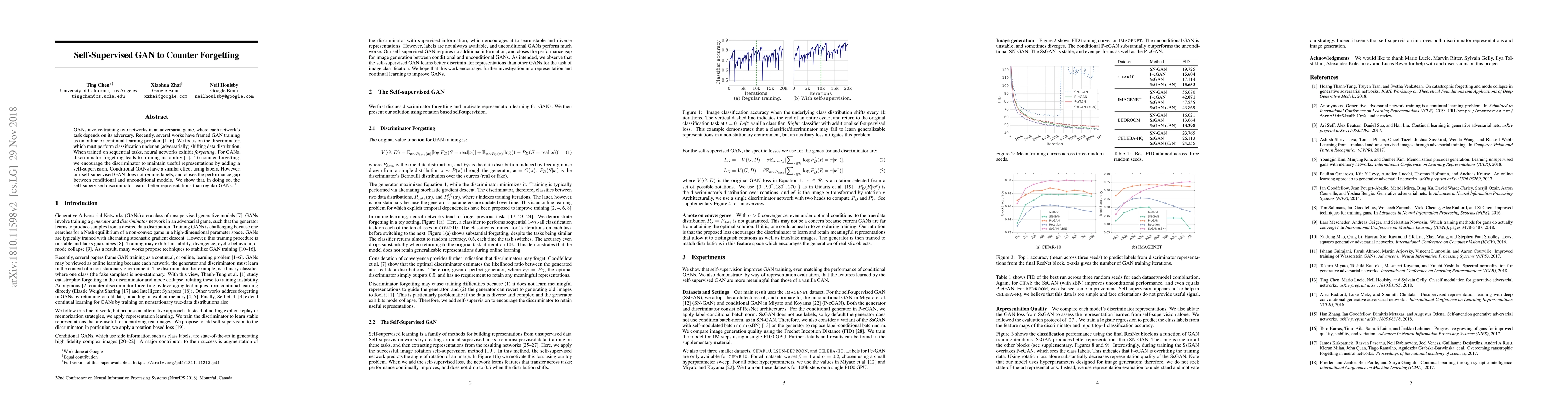 GANs involve training two networks in an adversarial game, where each network's task depends on its adversary. Recently, several works have framed GAN training as an online or continual learning problem. We focus on the discriminator, which must perform classification under an (adversarially) shifting data distribution. When trained on sequential tasks, neural networks exhibit \emph{forgetting}. For GANs, discriminator forgetting leads to training instability. To counter forgetting, we encourage the discriminator to maintain useful representations by adding a self-supervision. Conditional GANs have a similar effect using labels. However, our self-supervised GAN does not require labels, and closes the performance gap between conditional and unconditional models. We show that, in doing so, the self-supervised discriminator learns better representations than regular GANs.