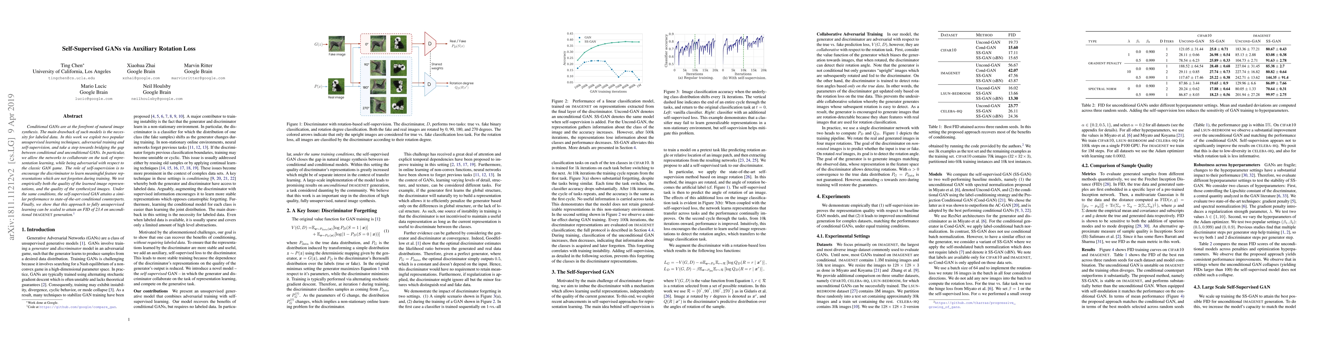 This paper proposes a self-supervised GAN that combines adversarial training with self-supervision using an auxiliary rotation loss to learn meaningful feature representations without labeled data. The approach achieves comparable performance to state-of-the-art conditional GANs and demonstrates scalability to generate high-quality images on ImageNet.