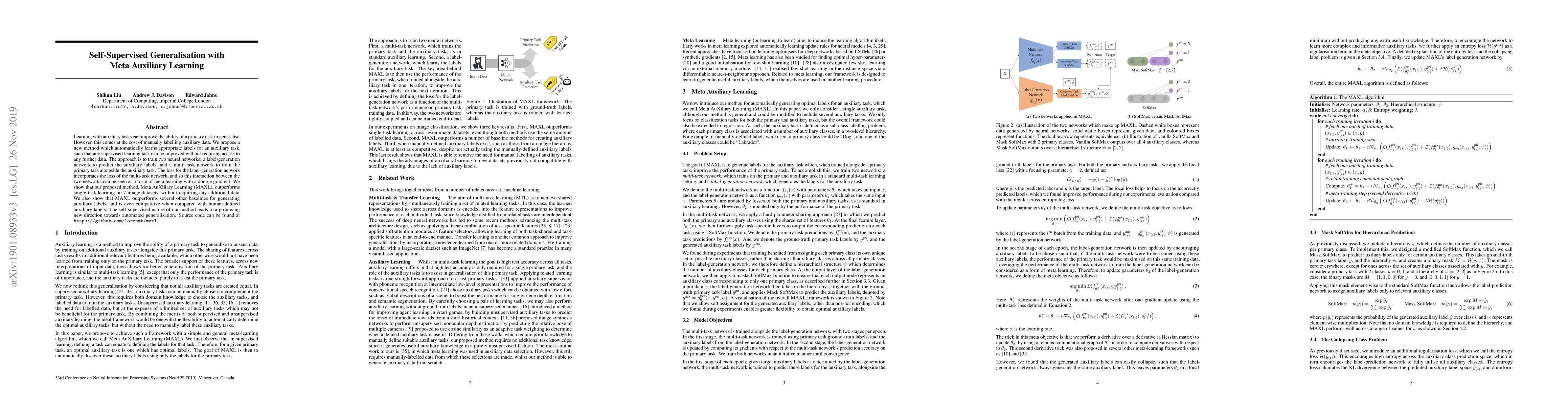 This paper introduces Meta AuXiliary Learning (MAXL), a self-supervised method that automatically generates labels for auxiliary tasks to improve primary task generalisation without requiring additional data. MAXL trains two neural networks, achieving superior performance on 7 image datasets compared to single-task learning and other baselines.