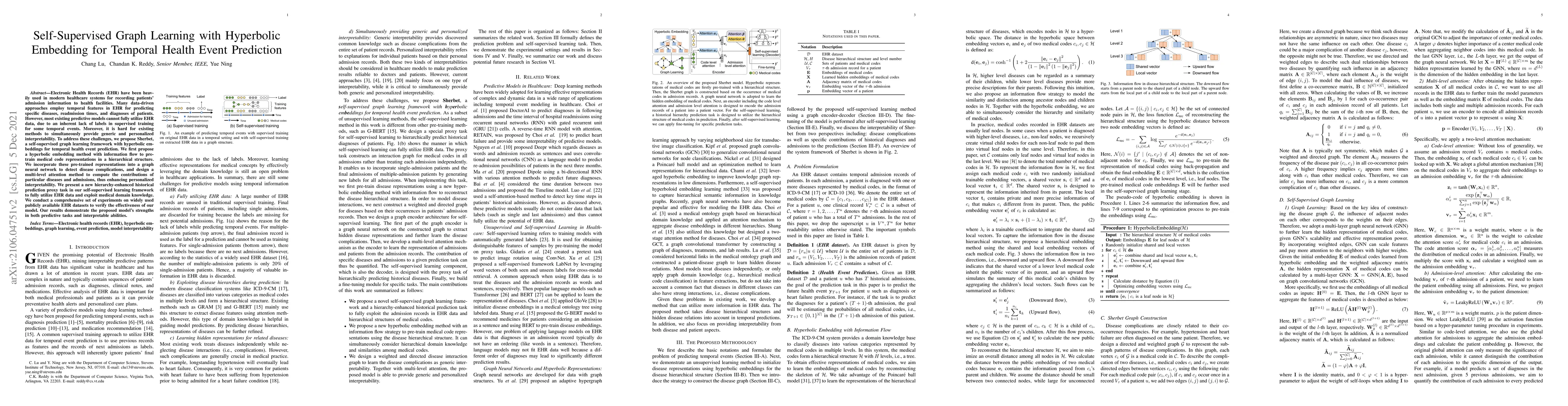 A new self-supervised learning framework is proposed to predict temporal health events using electronic health records (EHRs), leveraging hyperbolic embedding for personalized interpretability and effective predictive modeling.