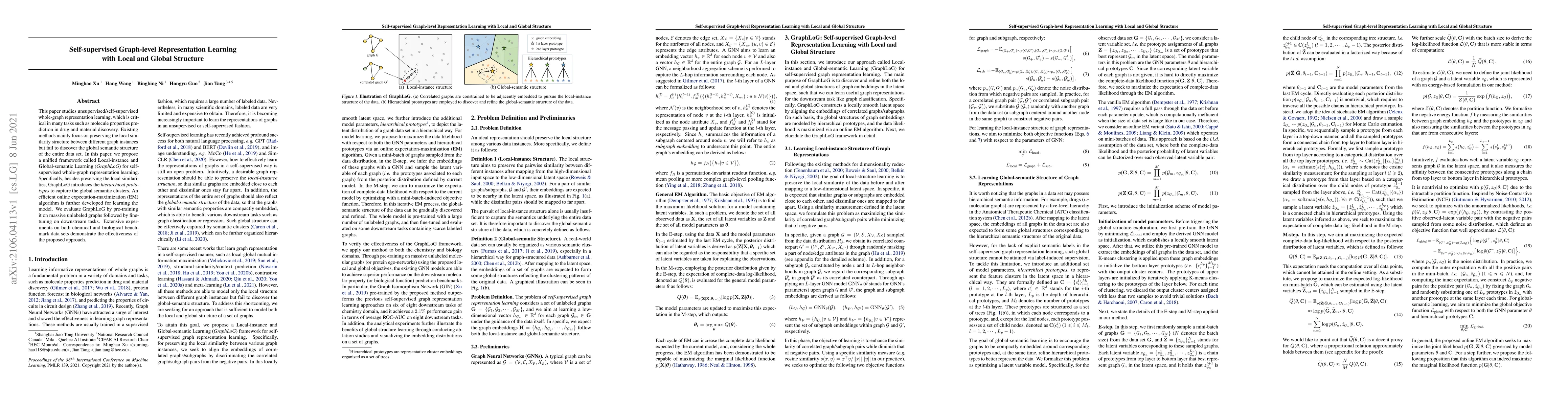This paper proposes GraphLoG, a self-supervised framework for learning whole-graph representations that preserves both local and global structures. It introduces hierarchical prototypes to capture global semantic clusters and uses an efficient online EM algorithm for learning, demonstrating effectiveness on chemical and biological datasets.