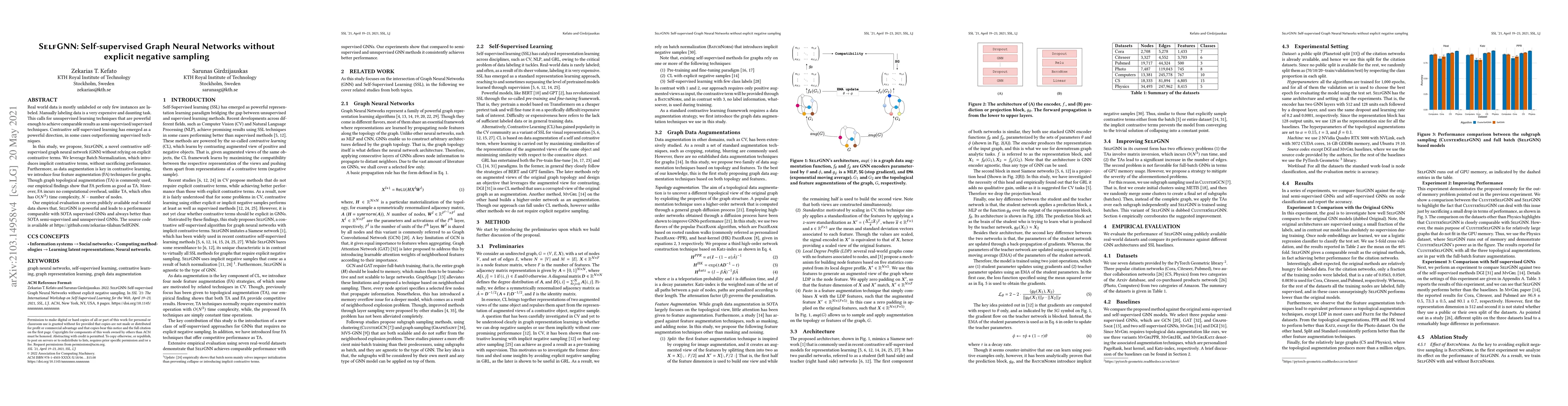 This paper introduces SelfGNN, a self-supervised graph neural network that leverages implicit contrastive terms via Batch Normalization without explicit negative sampling, achieving performance comparable to state-of-the-art supervised GNNs. It also proposes feature augmentation techniques that are as effective as topological augmentation but without the computational overhead.