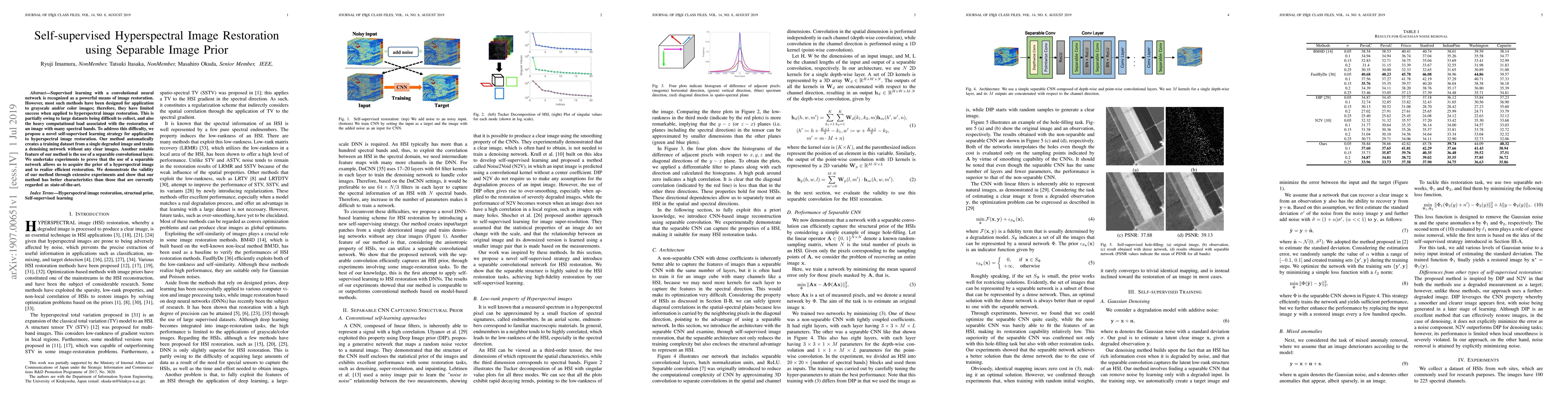 This paper proposes a self-supervised learning method for hyperspectral image restoration using a separable convolutional network, which generates a training dataset from a single degraded image, achieving efficient and effective restoration without clear image examples. Experimental results show superior performance compared to existing state-of-the-art methods.