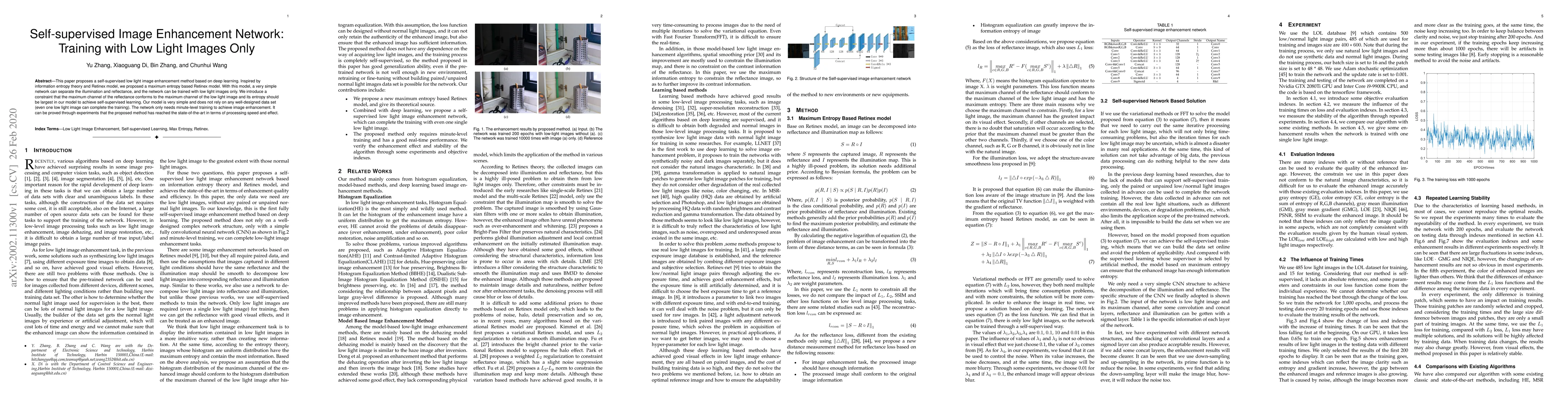 This paper proposes a self-supervised deep learning method for low light image enhancement using a maximum entropy based Retinex model, which can be trained solely with low light images and achieves state-of-the-art results in processing speed and enhancement effect.