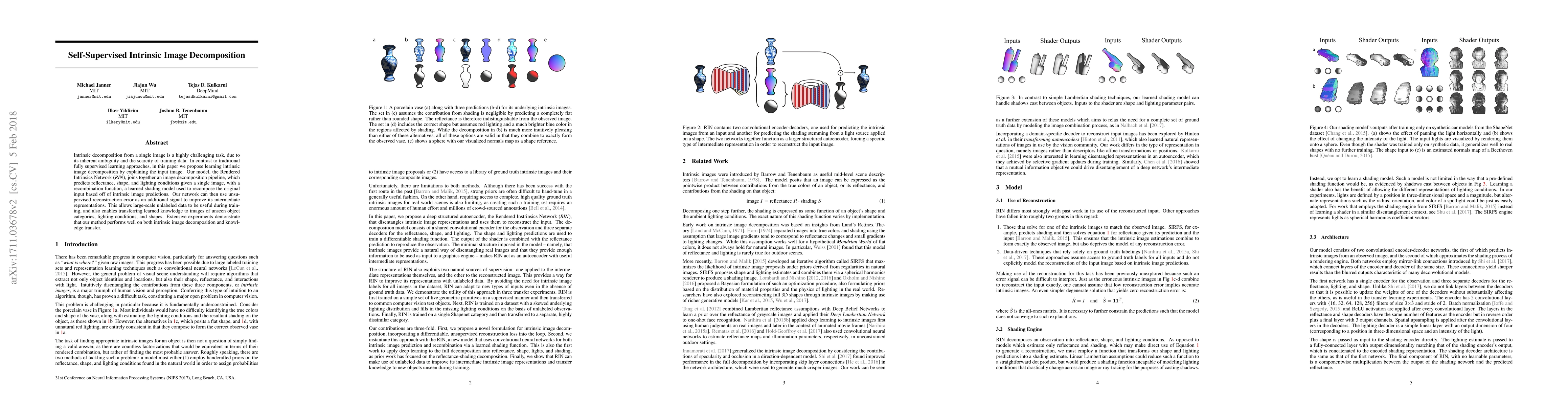This paper proposes the Rendered Intrinsics Network (RIN) to perform self-supervised intrinsic image decomposition by predicting reflectance, shape, and lighting using a single image. The model leverages unsupervised reconstruction error to improve intermediate representations, enabling effective knowledge transfer to new object categories and conditions.