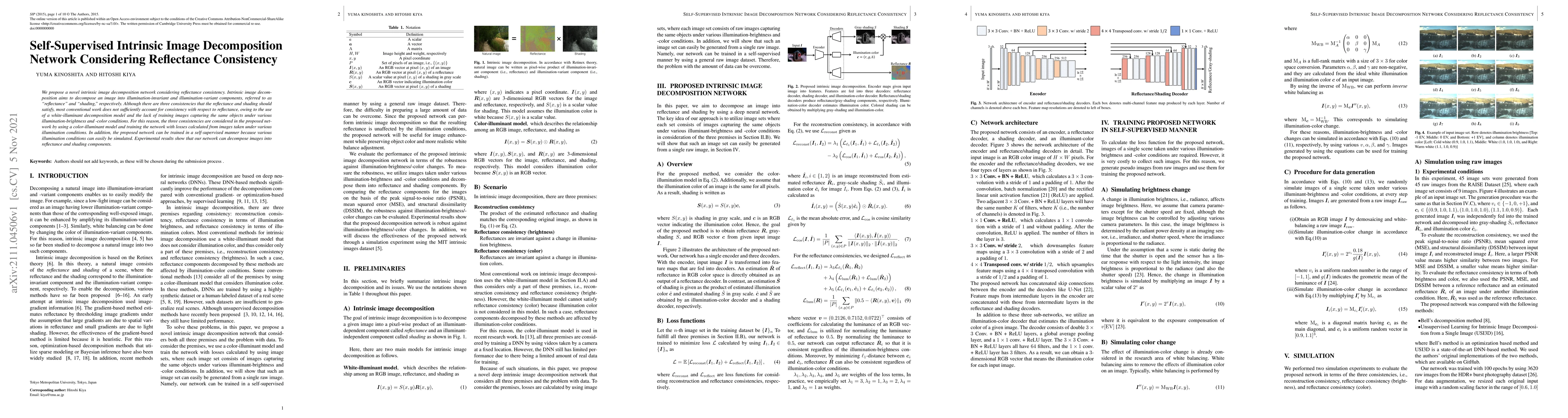 This paper proposes a self-supervised intrinsic image decomposition network that considers reflectance consistency through a color-illuminant model. It addresses the lack of training data under varied illumination conditions, achieving better decomposition of reflectance and shading components.