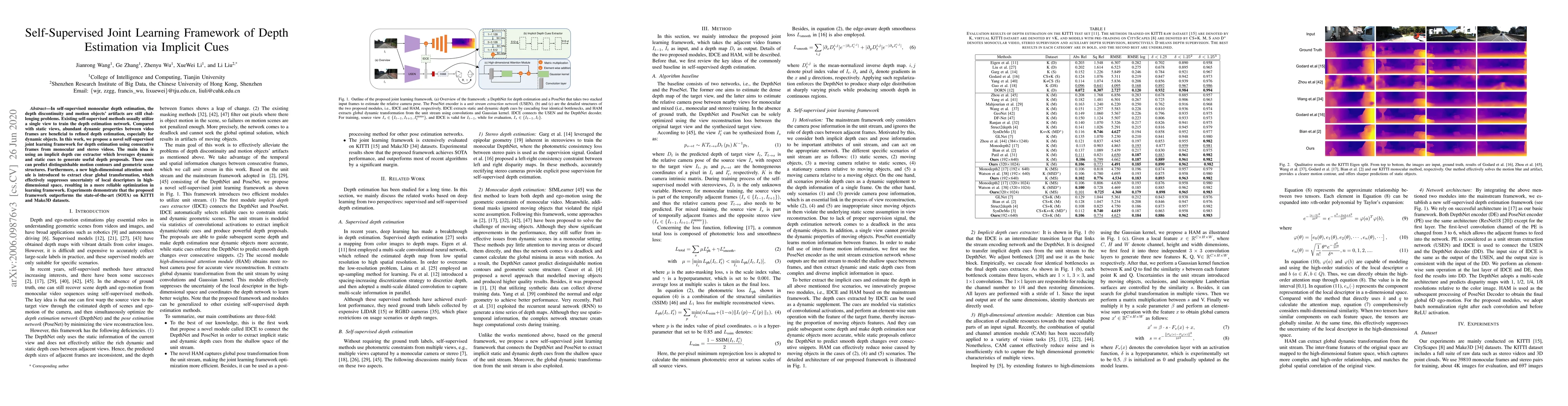 This paper proposes a self-supervised joint learning framework for monocular depth estimation using implicit depth cues from consecutive video frames. It introduces a high-dimensional attention module to suppress local descriptor uncertainty, leading to improved depth estimation, especially for dynamic objects. The framework outperforms existing methods on KITTI and Make3D datasets.