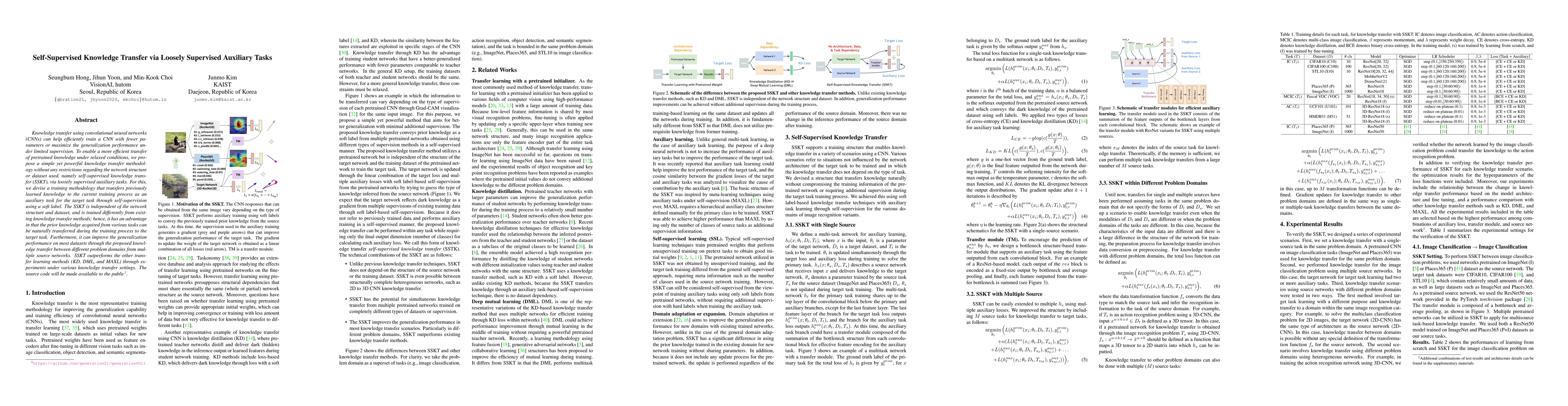 This paper proposes self-supervised knowledge transfer (SSKT) via loosely supervised auxiliary tasks, enabling efficient transfer of pretrained knowledge without restrictions on network structure or dataset. SSKT outperforms existing methods like KD, DML, and MAXL in generalization performance across various datasets.
