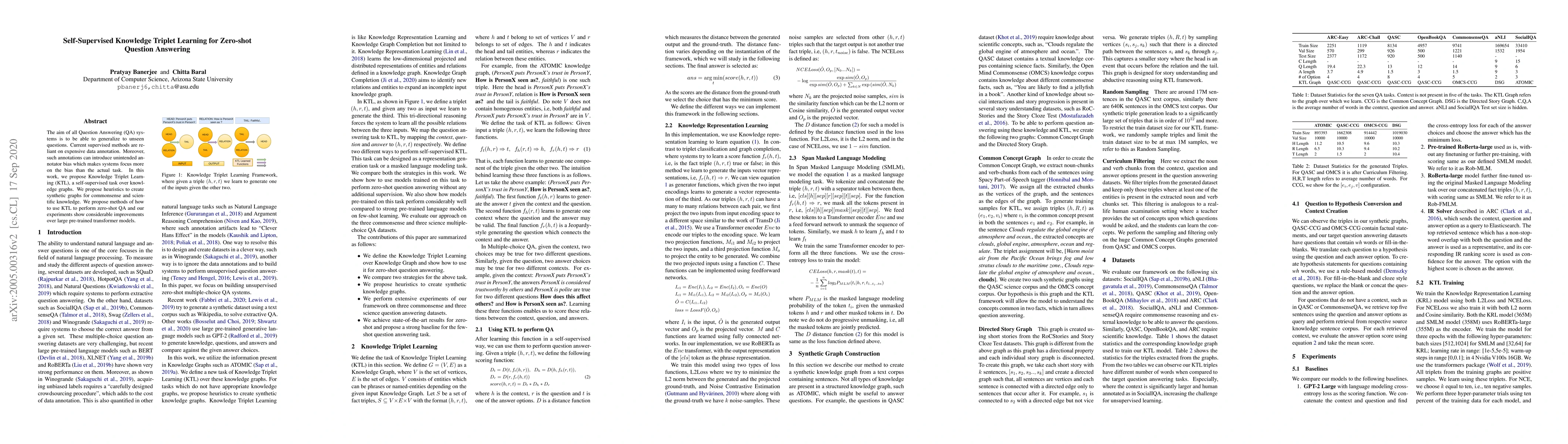 This paper proposes Knowledge Triplet Learning (KTL), a self-supervised method for zero-shot question answering using knowledge graphs. It introduces synthetic knowledge graphs to reduce reliance on expensive data annotations and demonstrates significant improvements over pre-trained transformer models.