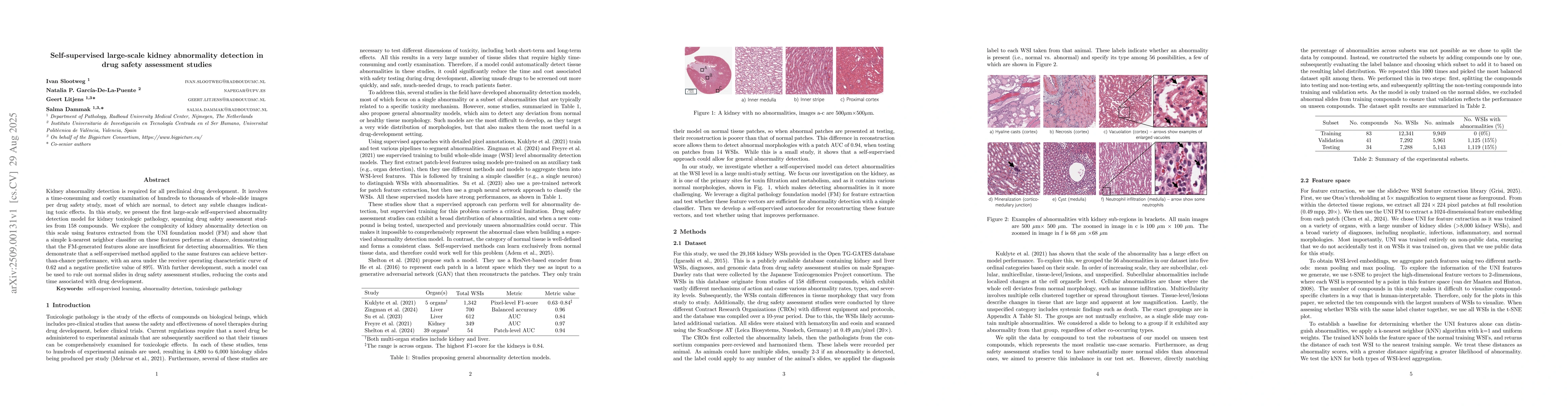 Kidney abnormality detection is required for all preclinical drug development. It involves a time-consuming and costly examination of hundreds to thousands of whole-slide images per drug safety study, most of which are normal, to detect any subtle changes indicating toxic effects. In this study, we present the first large-scale self-supervised abnormality detection model for kidney toxicologic pathology, spanning drug safety assessment studies from 158 compounds. We explore the complexity of kidney abnormality detection on this scale using features extracted from the UNI foundation model (FM) and show that a simple k-nearest neighbor classifier on these features performs at chance, demonstrating that the FM-generated features alone are insufficient for detecting abnormalities. We then demonstrate that a self-supervised method applied to the same features can achieve better-than-chance performance, with an area under the receiver operating characteristic curve of 0.62 and a negative predictive value of 89%. With further development, such a model can be used to rule out normal slides in drug safety assessment studies, reducing the costs and time associated with drug development.