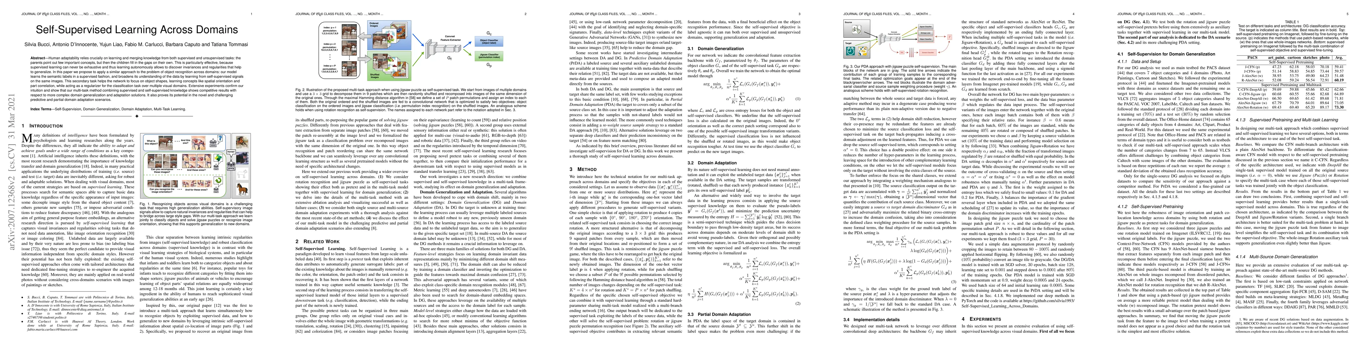 This paper proposes a self-supervised learning approach to enhance object recognition across different visual domains by combining supervised and self-supervised learning. The model achieves competitive results in domain generalization and adaptation, demonstrating its effectiveness in predictive and partial domain adaptation scenarios.