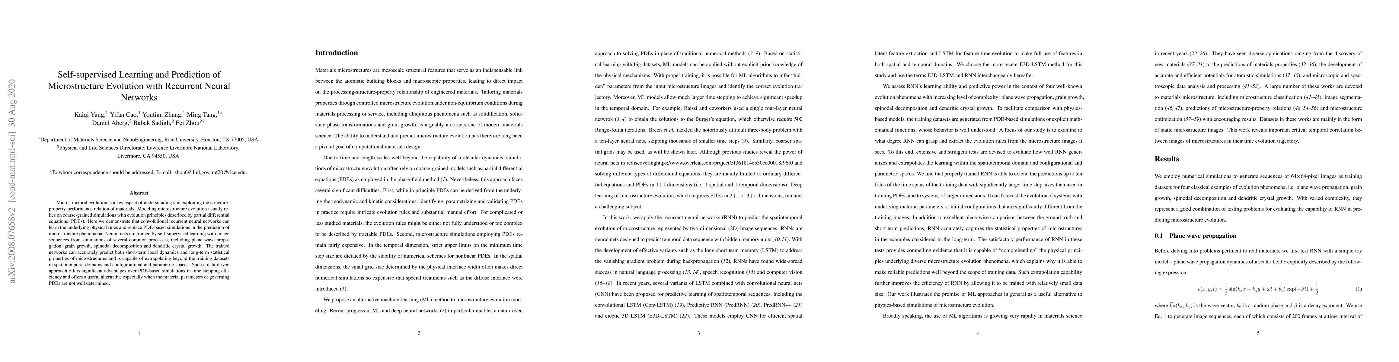 This paper demonstrates that convolutional recurrent neural networks can predict microstructure evolution using self-supervised learning, replacing traditional PDE-based simulations. The trained neural networks accurately predict short-term dynamics and long-term statistical properties, offering efficiency advantages when material parameters are uncertain.