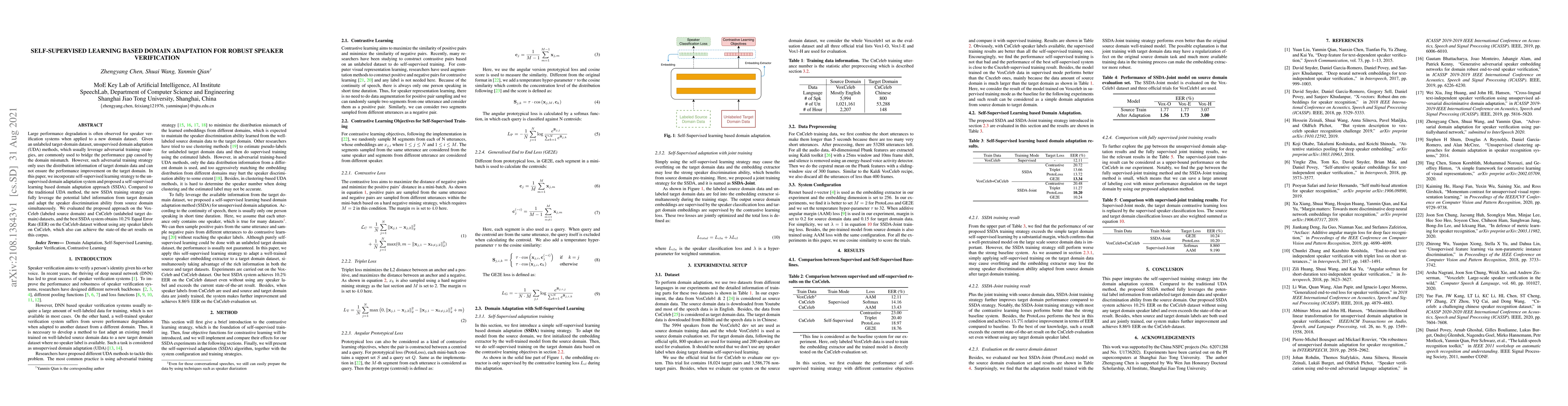 This paper proposes a self-supervised learning based domain adaptation (SSDA) approach to improve speaker verification performance across different domains. Unlike traditional unsupervised domain adaptation, SSDA leverages label information from the target domain to enhance speaker discrimination, achieving a 10.2% Equal Error Rate on the CnCeleb dataset without using any labeled data from it.