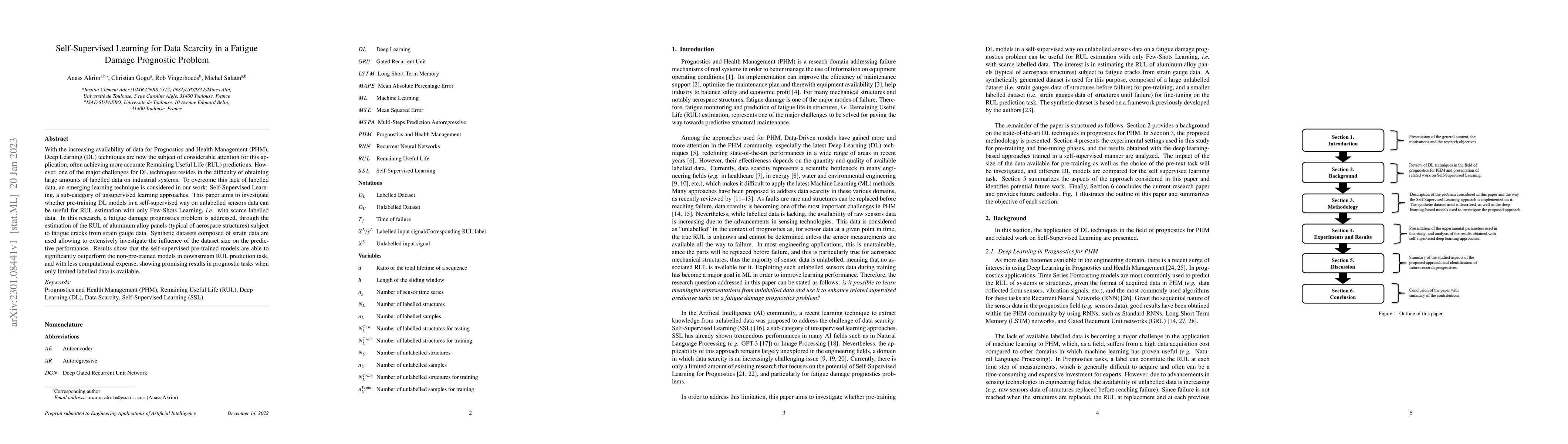 This paper explores the use of Self-Supervised Learning to pre-train Deep Learning models for estimating the Remaining Useful Life (RUL) of aluminum alloy panels under fatigue damage, addressing the challenge of data scarcity. The results indicate that self-supervised pre-training significantly improves RUL predictions with limited labelled data, demonstrating potential for prognostic tasks in industrial systems.