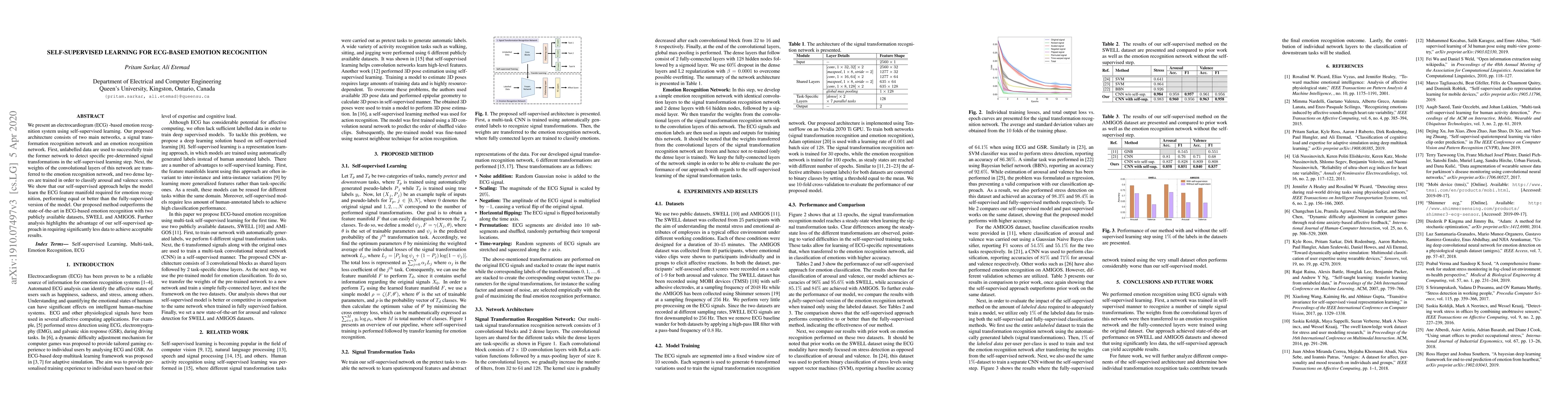 This paper proposes a self-supervised learning method for ECG-based emotion recognition using two networks: one for signal transformation and another for emotion classification. The self-supervised approach requires less data and outperforms the state-of-the-art on two datasets.