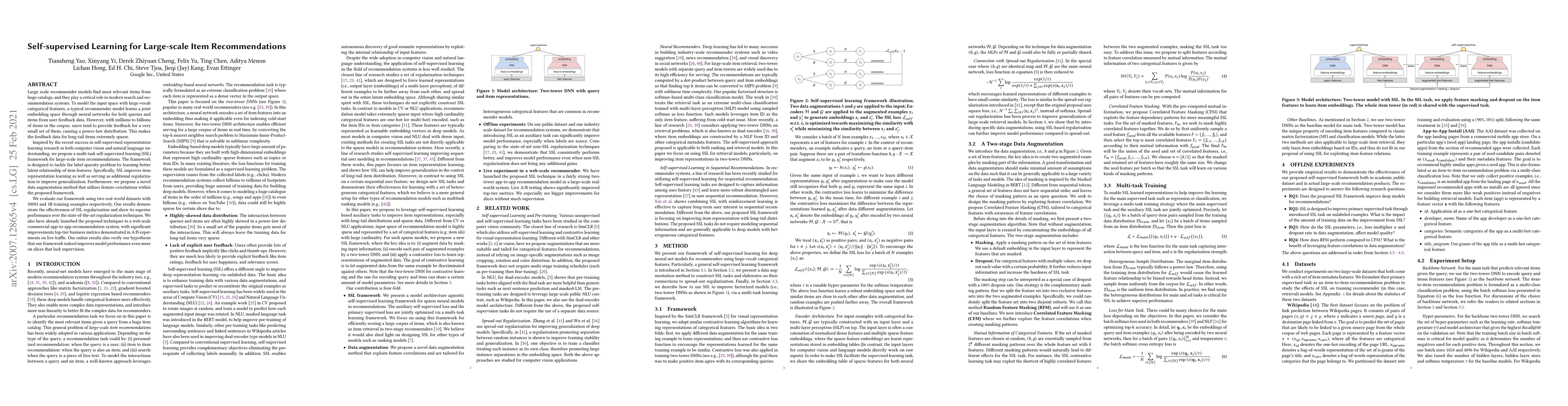 This paper proposes a multi-task self-supervised learning framework to enhance large-scale item recommendation systems, addressing the issue of sparse feedback data for long-tail items. The framework improves item representation learning and generalization, demonstrating superior performance over state-of-the-art techniques in evaluations and real-world applications.