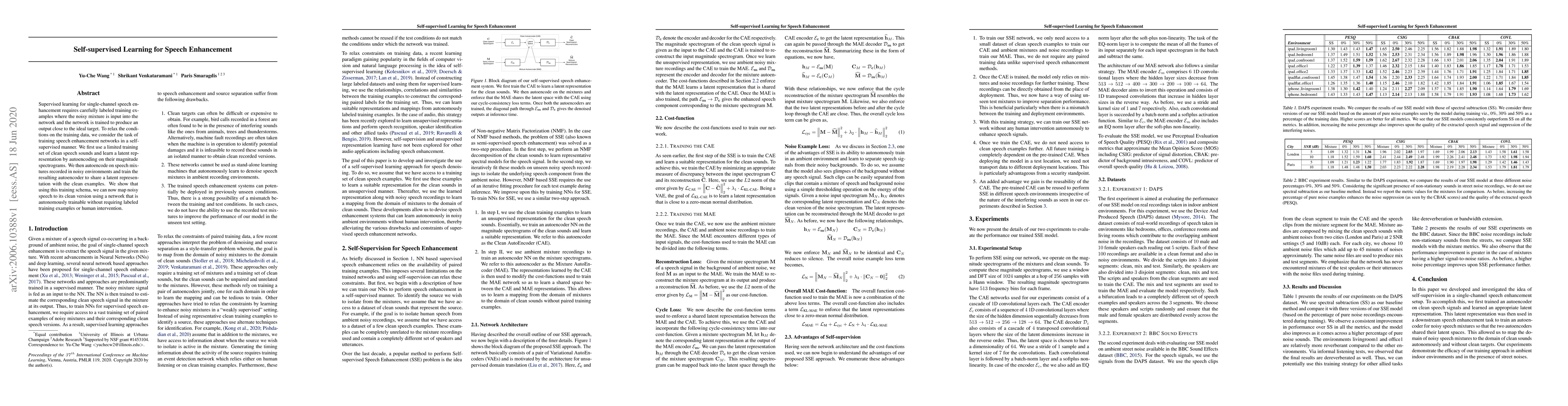 Supervised learning for single-channel speech enhancement requires carefully labeled training examples where the noisy mixture is input into the network and the network is trained to produce an output close to the ideal target. To relax the conditions on the training data, we consider the task of training speech enhancement networks in a self-supervised manner. We first use a limited training set of clean speech sounds and learn a latent representation by autoencoding on their magnitude spectrograms. We then autoencode on speech mixtures recorded in noisy environments and train the resulting autoencoder to share a latent representation with the clean examples. We show that using this training schema, we can now map noisy speech to its clean version using a network that is autonomously trainable without requiring labeled training examples or human intervention.