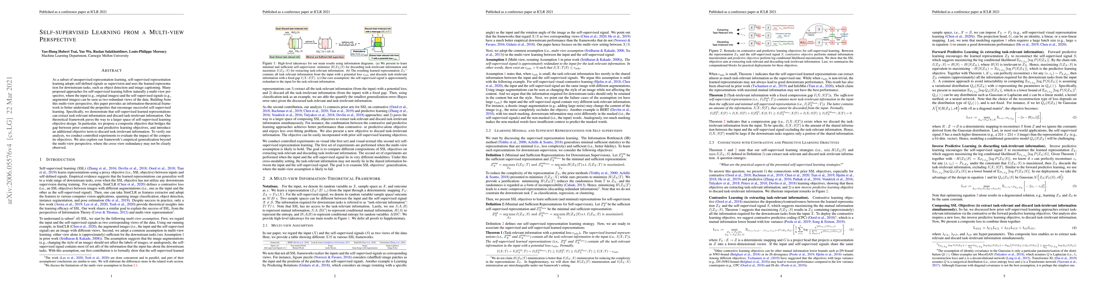 This paper develops an information-theoretical framework for self-supervised learning from a multi-view perspective, demonstrating that self-supervised representations can extract task-relevant information while discarding irrelevant information. It proposes a composite objective combining contrastive and predictive learning to enhance learning efficiency.
