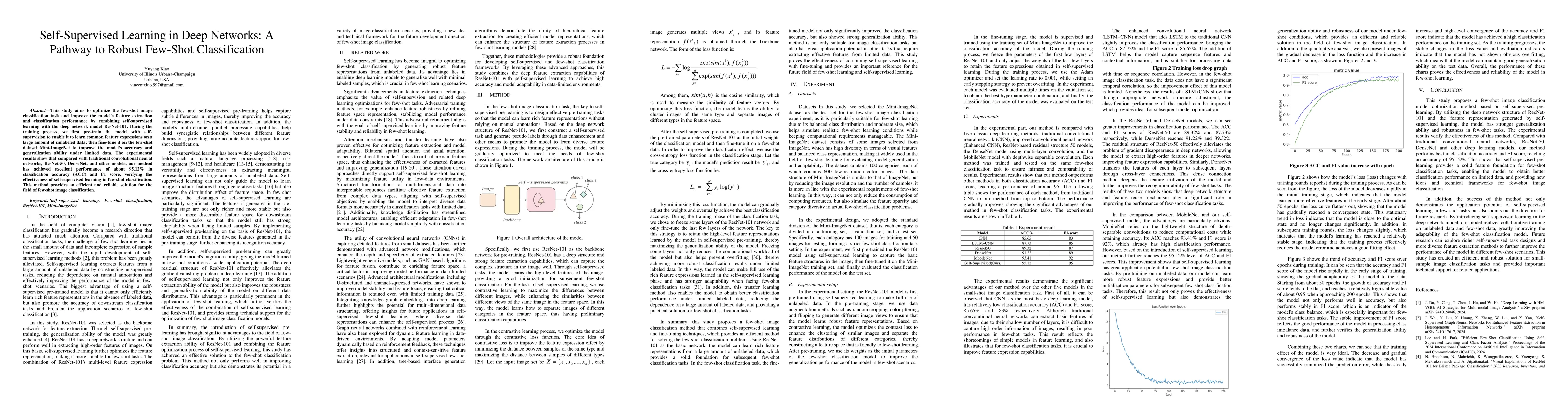 This paper combines self-supervised learning with ResNet-101 to enhance few-shot image classification performance. Pre-training on unlabeled data followed by fine-tuning on Mini-ImageNet achieves 95.12% classification accuracy, outperforming traditional CNNs and other models.