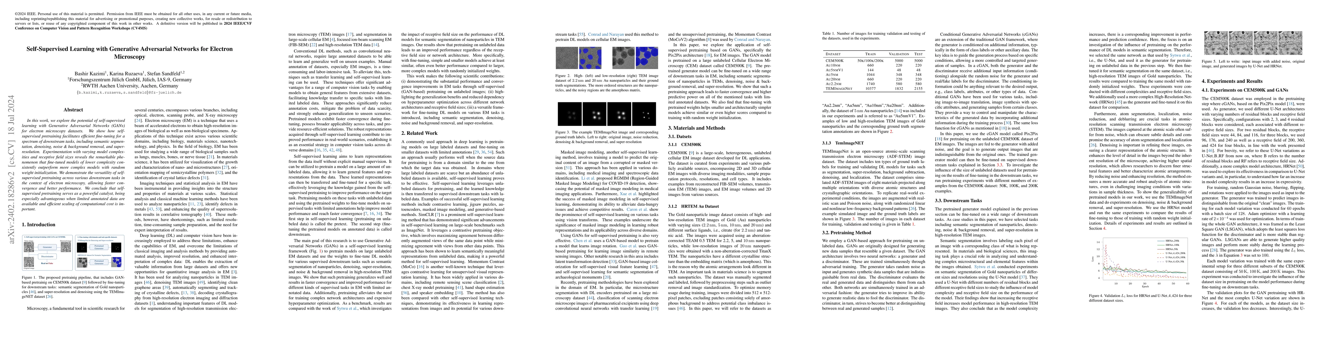 In this work, we explore the potential of self-supervised learning from unlabeled electron microscopy datasets, taking a step toward building a foundation model in this field. We show how self-supervised pretraining facilitates efficient fine-tuning for a spectrum of downstream tasks, including semantic segmentation, denoising, noise & background removal, and super-resolution. Experimentation with varying model complexities and receptive field sizes reveals the remarkable phenomenon that fine-tuned models of lower complexity consistently outperform more complex models with random weight initialization. We demonstrate the versatility of self-supervised pretraining across various downstream tasks in the context of electron microscopy, allowing faster convergence and better performance. We conclude that self-supervised pretraining serves as a powerful catalyst, being especially advantageous when limited annotated data are available and efficient scaling of computational cost are important.