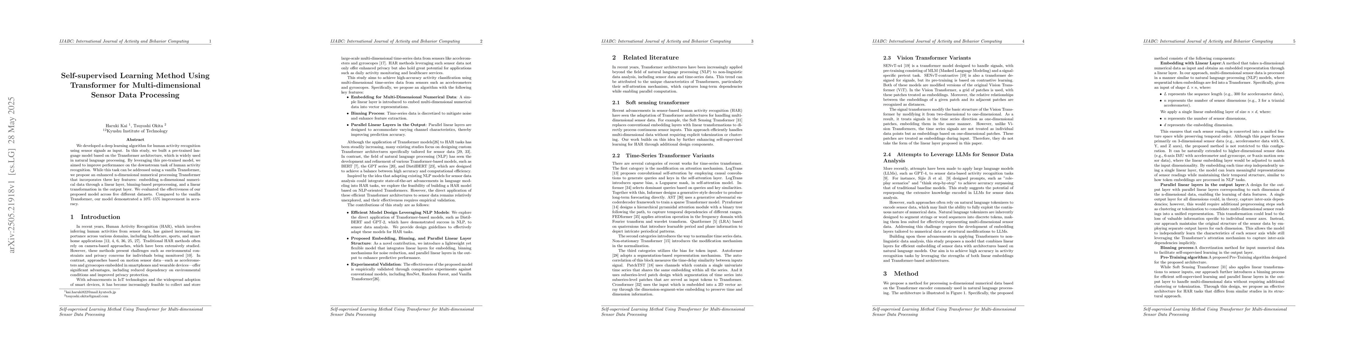 We developed a deep learning algorithm for human activity recognition using sensor signals as input. In this study, we built a pretrained language model based on the Transformer architecture, which is widely used in natural language processing. By leveraging this pretrained model, we aimed to improve performance on the downstream task of human activity recognition. While this task can be addressed using a vanilla Transformer, we propose an enhanced n-dimensional numerical processing Transformer that incorporates three key features: embedding n-dimensional numerical data through a linear layer, binning-based pre-processing, and a linear transformation in the output layer. We evaluated the effectiveness of our proposed model across five different datasets. Compared to the vanilla Transformer, our model demonstrated 10%-15% improvements in accuracy.