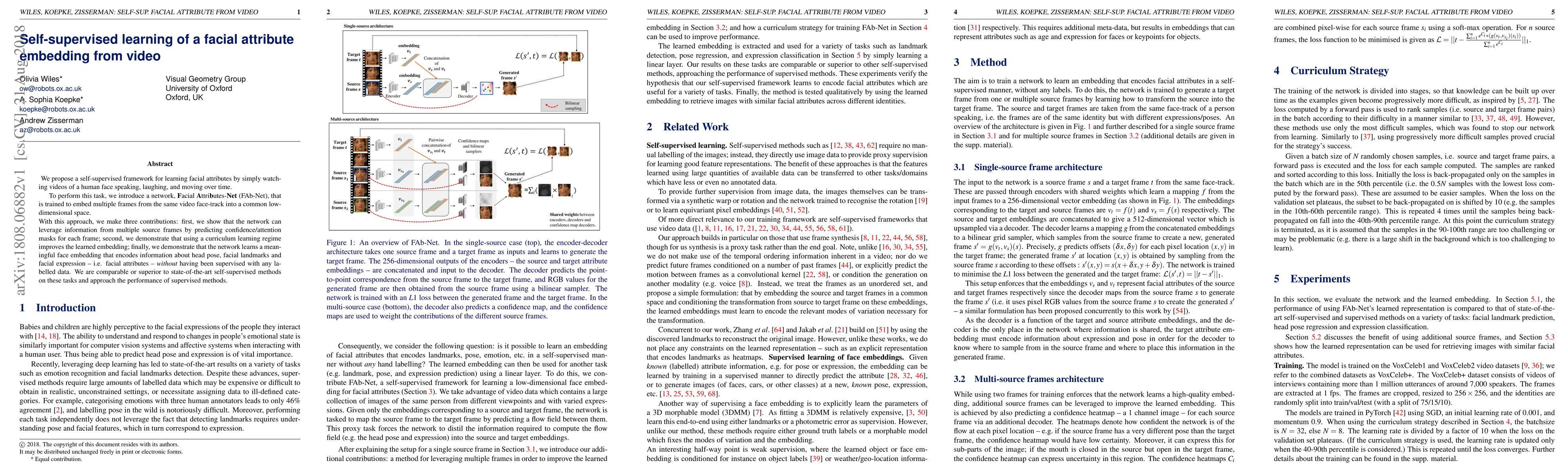 This paper proposes a self-supervised framework, FAb-Net, to learn facial attribute embeddings from video by tracking faces over time. It leverages multiple frames and uses curriculum learning to improve the embedding, achieving meaningful representations of head pose, landmarks, and expressions without labeled data.