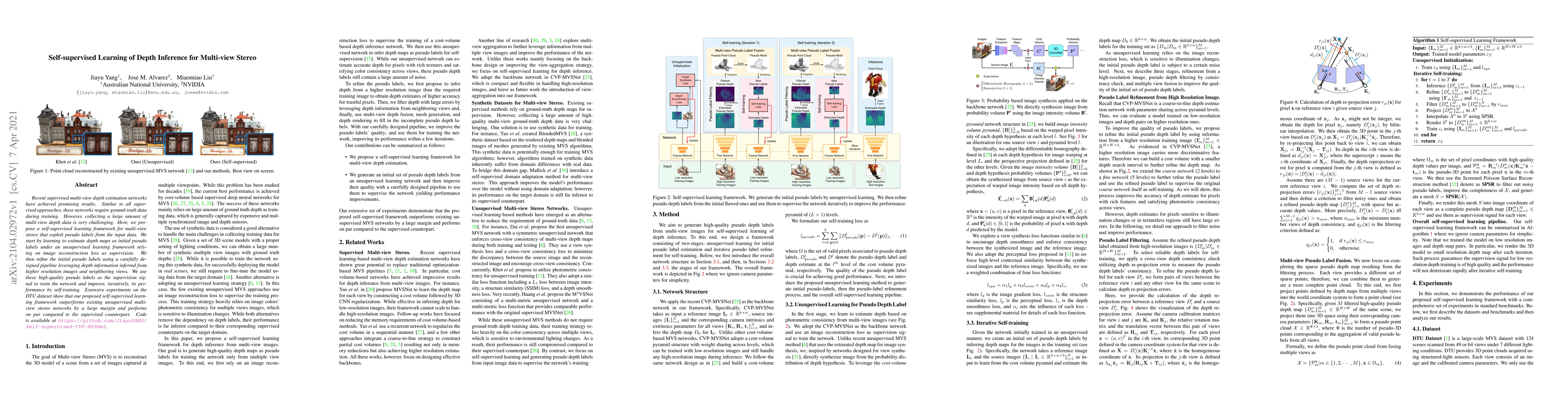 The paper proposes a self-supervised learning framework for depth inference in multi-view stereo, utilizing pseudo labels from input data. The framework starts with unsupervised learning to estimate depth maps as initial pseudo labels, then refines these labels using a pipeline leveraging higher resolution images and neighboring views. The high-quality pseudo labels serve as supervision signals to iteratively train the network.