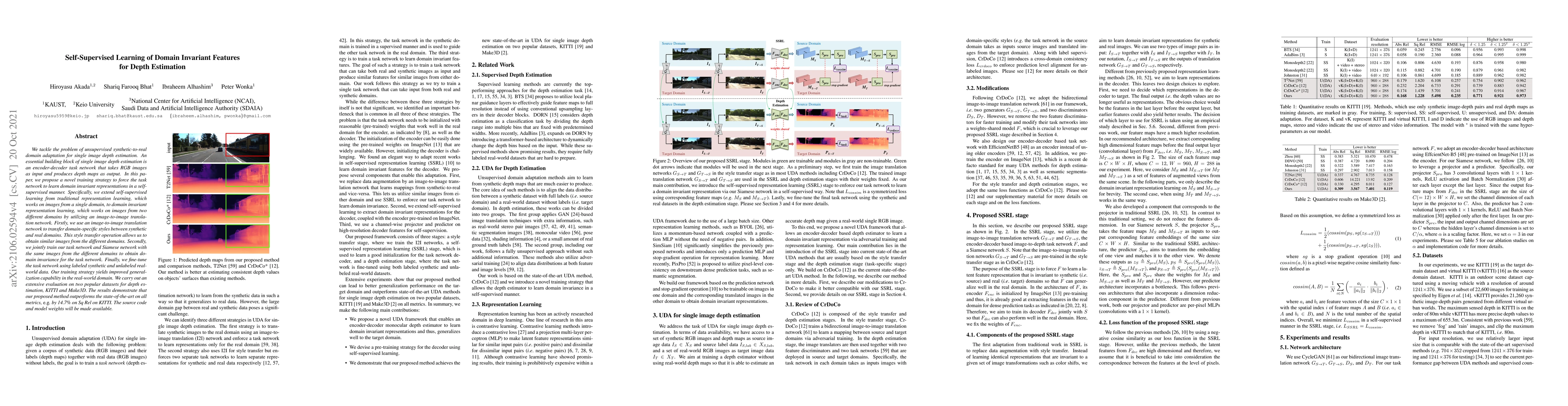 We tackle the problem of unsupervised synthetic-to-real domain adaptation for single image depth estimation. An essential building block of single image depth estimation is an encoder-decoder task network that takes RGB images as input and produces depth maps as output. In this paper, we propose a novel training strategy to force the task network to learn domain invariant representations in a selfsupervised manner. Specifically, we extend self-supervised learning from traditional representation learning, which works on images from a single domain, to domain invariant representation learning, which works on images from two different domains by utilizing an image-to-image translation network. Firstly, we use an image-to-image translation network to transfer domain-specific styles between synthetic and real domains. This style transfer operation allows us to obtain similar images from the different domains. Secondly, we jointly train our task network and Siamese network with the same images from the different domains to obtain domain invariance for the task network. Finally, we fine-tune the task network using labeled synthetic and unlabeled realworld data. Our training strategy yields improved generalization capability in the real-world domain. We carry out an extensive evaluation on two popular datasets for depth estimation, KITTI and Make3D. The results demonstrate that our proposed method outperforms the state-of-the-art on all metrics, e.g. by 14.7% on Sq Rel on KITTI. The source code and model weights will be made available.