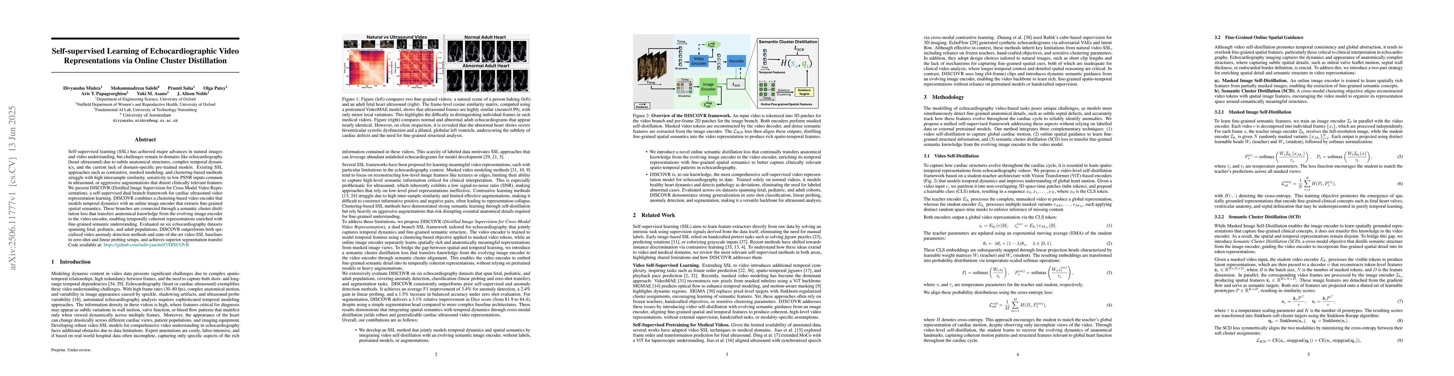 The research introduces DISCOVR, a self-supervised dual branch framework for learning representations from echocardiographic videos. DISCOVR outperforms existing methods in zero-shot and linear probing setups, and achieves superior segmentation transfer across various echocardiography datasets, addressing challenges in this medical imaging domain.